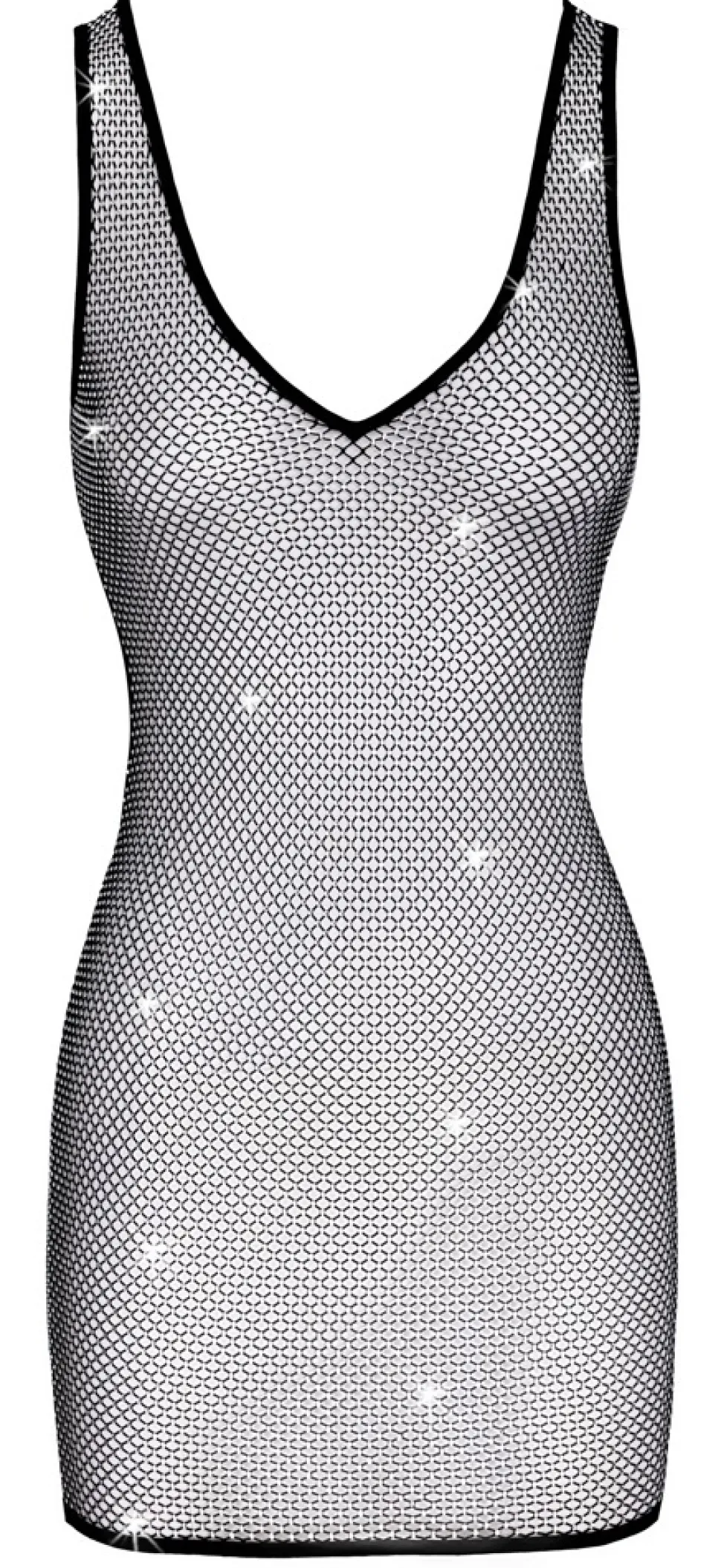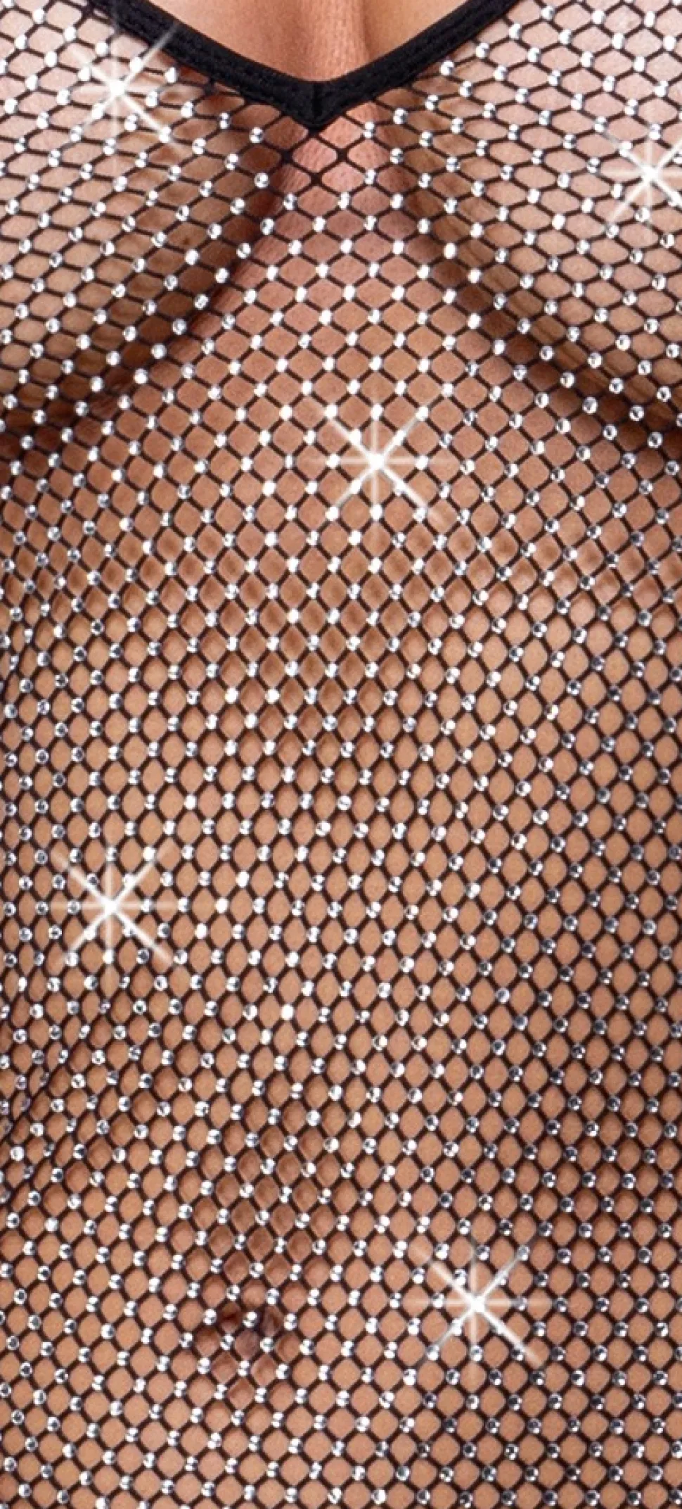 Tailliertes Träger-Minikleid von Cottelli PARTY aus extravaganten Netzmaschen, über und über mit funkelnden Strass-Steinchen besetzt. Ausschnitte und Saum sorgfältig in Schwarz paspeliert. Weich und anschmiegsam für hohen Tragekomfort.