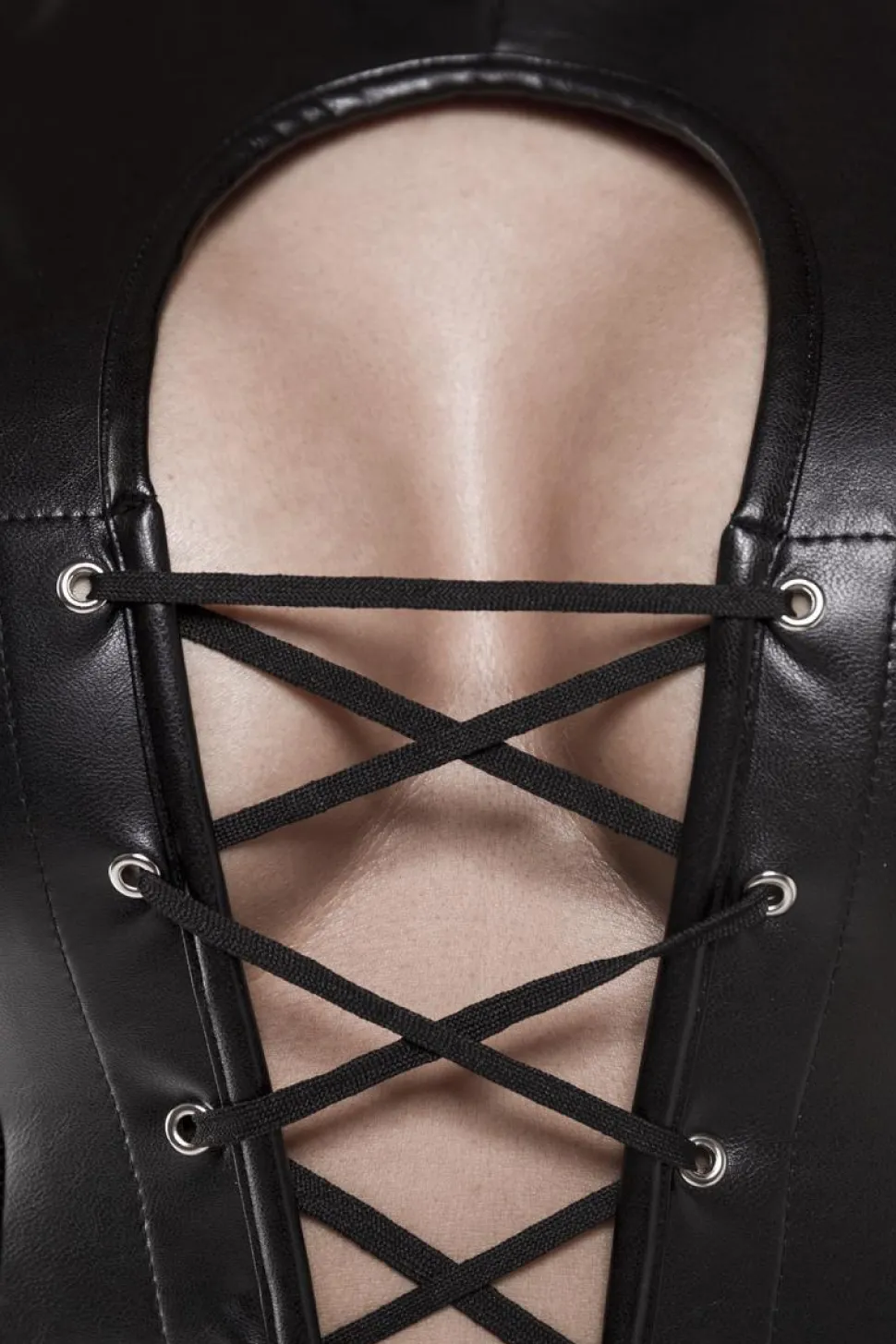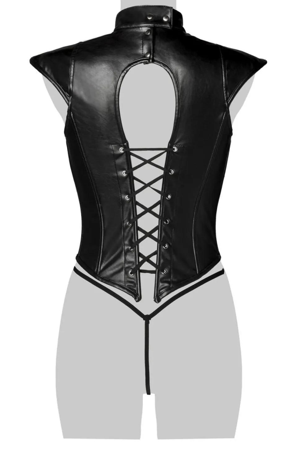 Die Schnürung befindet sich sowohl auf der Vorder- und der Rückseite. Der schmale Stehkragen ist mit einem Druckknopf versehen und die abgeschnittene Schulter geben dieser Corsage, das heiße etwas. Der passende String rundet dieses Set ab. MUST HAVE!