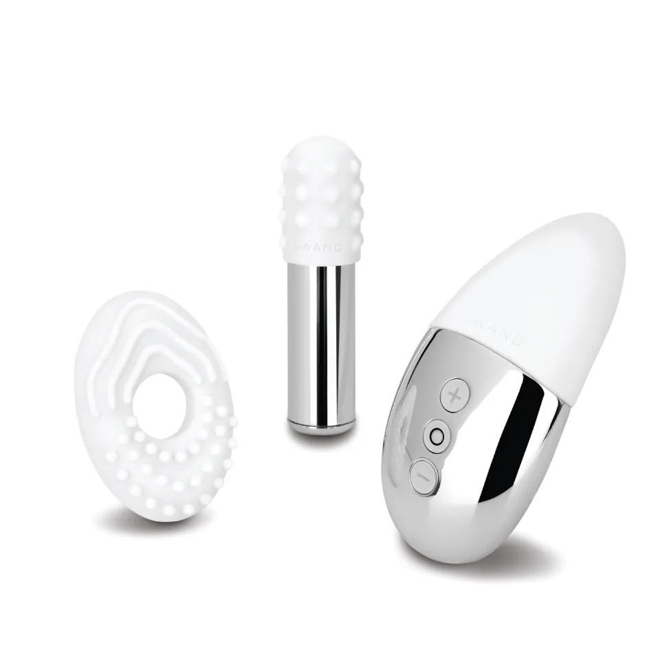 So wie das Schwelgen in den einfachen Freuden des Lebens täglich Freude bereiten kann, enthält das Chrome Little Pleasures-Set von Le Wand das Wesentliche für sofortige sinnliche Befriedigung. Ausgestattet mit den wiederaufladbaren Le Wand Bullet- und Point-Vibes in einem glänzenden Special Edition White- und Silver Chrome-Finish, liefert jeder kraftvolle handflächengroße Vibe seine eigene einzigartige Stimulation. Le Wand Point verfügt über eine körpersichere Silikonform und intuitive Bedienelemente, während der Bullet mit einer abnehmbaren strukturierten Silikonhülle und einem Ring für zusätzliches Vergnügen ausgestattet ist. Jeder Vibe ist mit dem mitgelieferten Ladegerät über USB wiederaufladbar und kann in der samtigen Aufbewahrungstasche des Sets aufbewahrt werden. Zeigen Sie Ihre Sex-Positivität mit dem entzückenden Le Wand-Pin, der ebenfalls enthalten ist. Set beinhaltet: Le Wand Bullet Rechargeable Vibrator Le Wand Point Rechargeable Vibrator Textured Silicone Sleeve & Ring Le Wand Enamel Pin Micro-Suede Travel Pouch USB Charging Cable