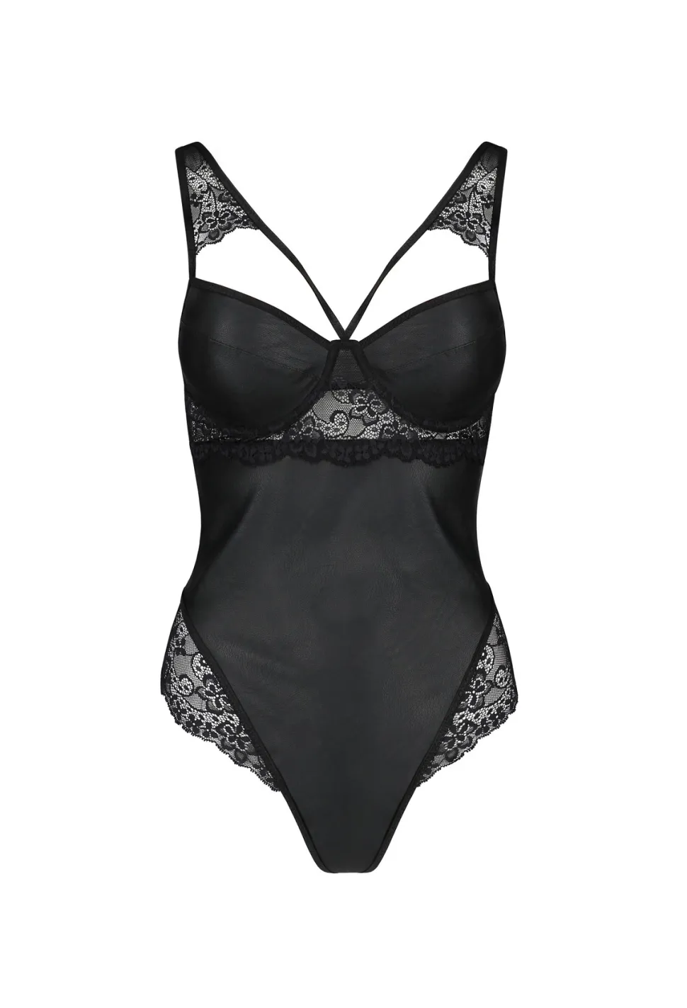 - Sexy Stringbody gefertigt aus einem Mix aus zarter Blütenspitze sowie lederartigem Material