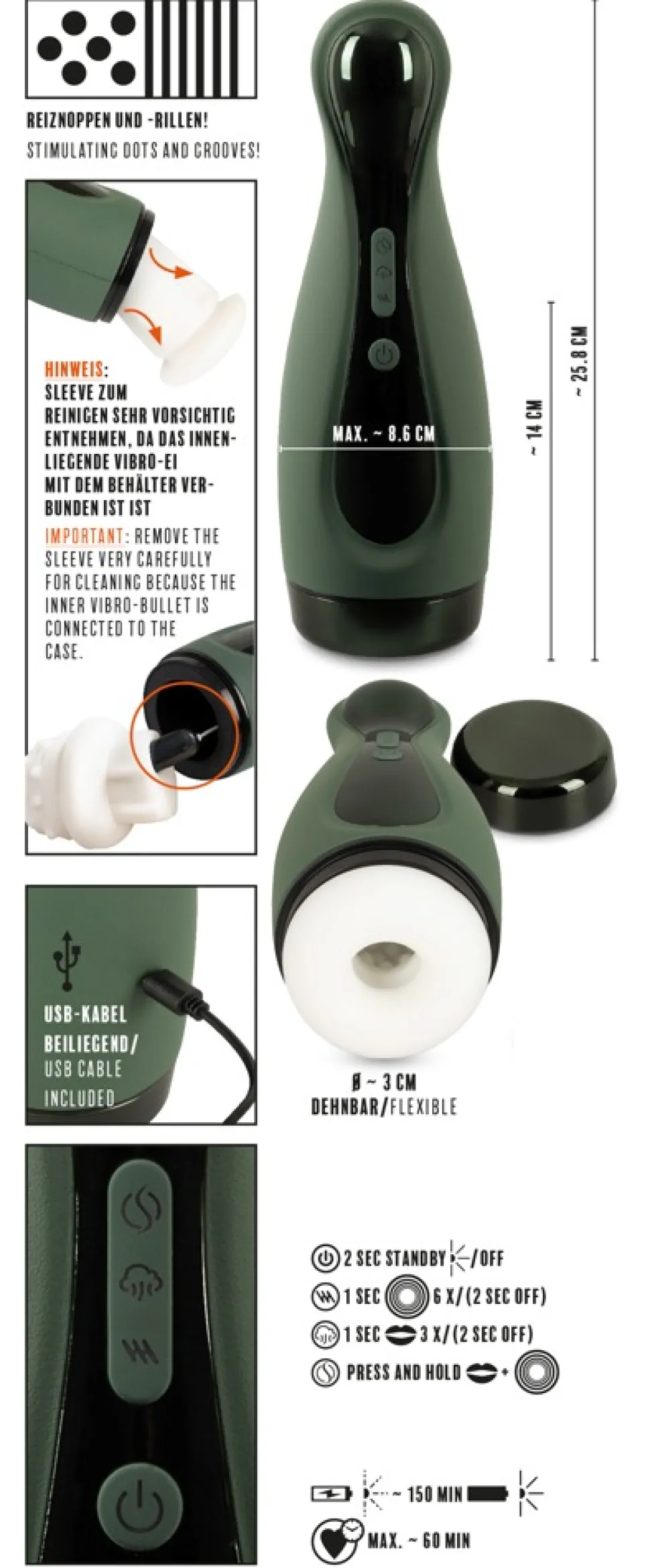 Der Innensleeve ist mit unzähligen weichen Massagenoppen und -rillen bestückt und für die einfache Reinigung herausnehmbar. Der Masturbator lässt sich (staub)sicher und diskret mit der beiliegenden Schutzkappe verwahren.