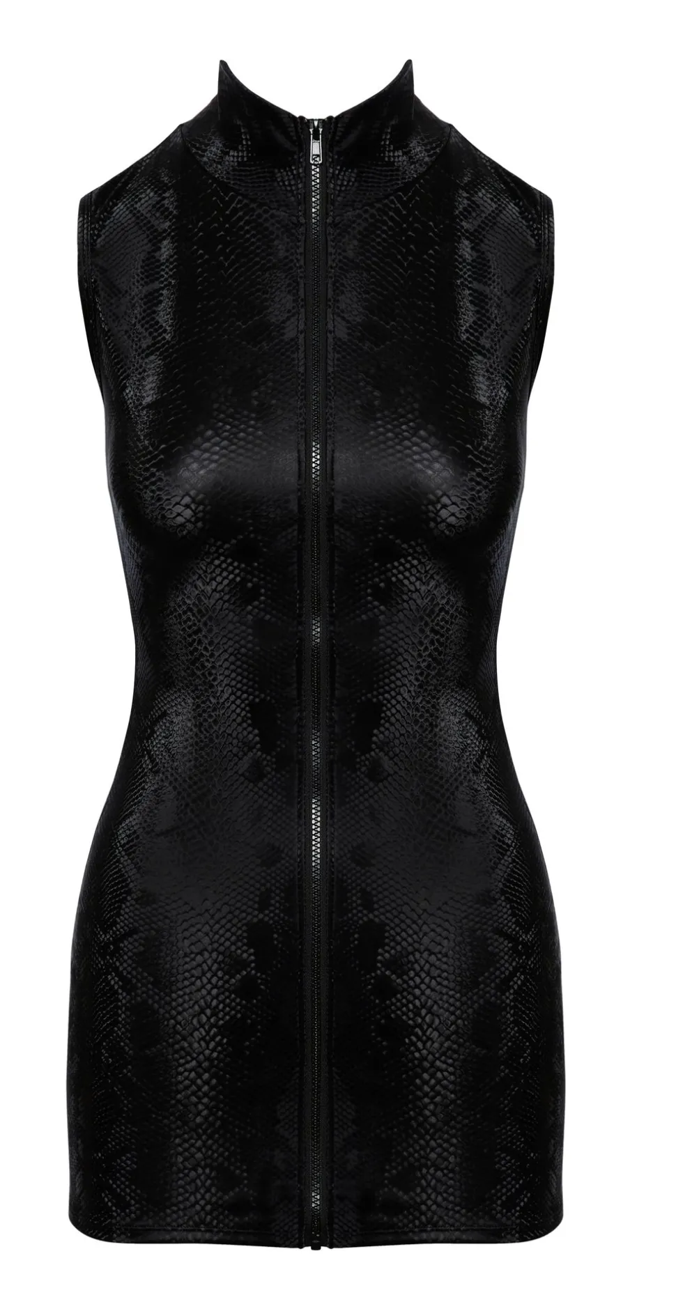 Enges kurzes ärmelloses Kleid von Cottelli PARTY in mattglänzend schillernder Schlangenhaut-Optik. Vorne mit durchgehendem Reißverschluss vom hohen Stehkragen bis zum Saum. Fantastisch elastisch für hautnahen Sitz, Passformsicherheit und hohen Tragekomfort.