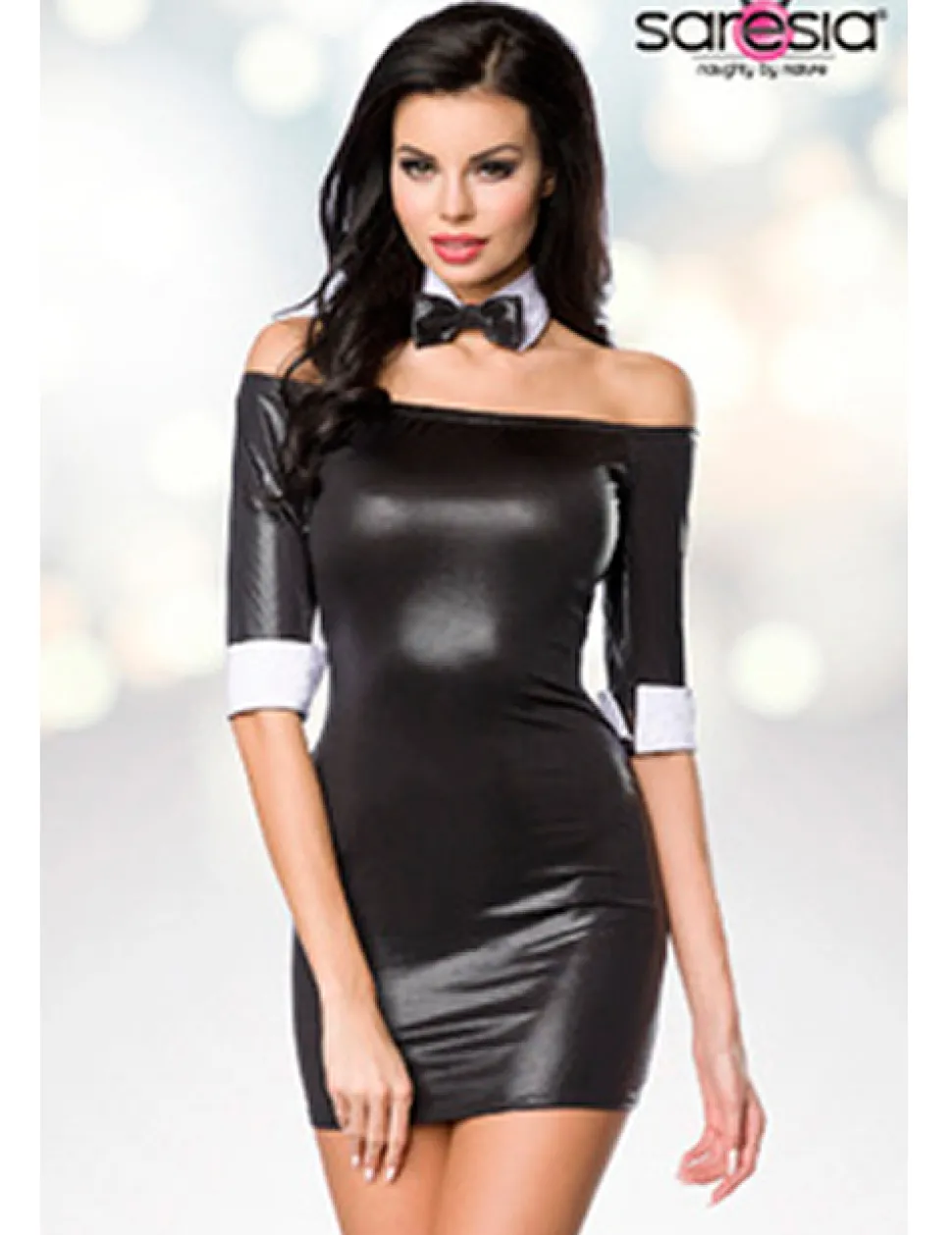 Das „Kleine Schwarze“ für mehr Glanz und Glamour. Dieses Minikleid ist aus softem, elastischem Material im Metallic-Look, das im Spiel des Lichtes geheimnisvoll irisiert. So beschert es Ihnen immer einen besonders glanzvollen Auftritt. Besonders originell: Der Kragen mit Fliege ist mit einem Klettverschluss ausgestattet. Die ¾-Ärmel enden mit weißen Manschetten. Verführerische, schulterfreie Linienführung, sexy auf Figur gearbeitet. Dank der hohen Elastizität des Material lässt erlaubt das Kleid trotz des hautengen Sitzes optimale Bewegungsfreiheit.