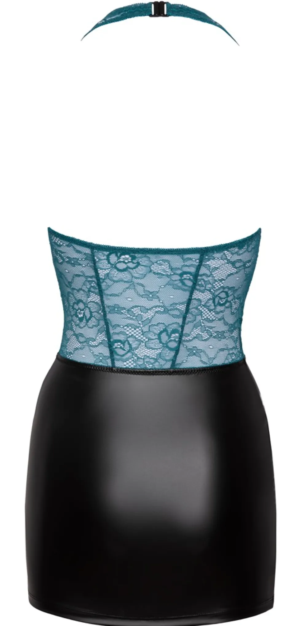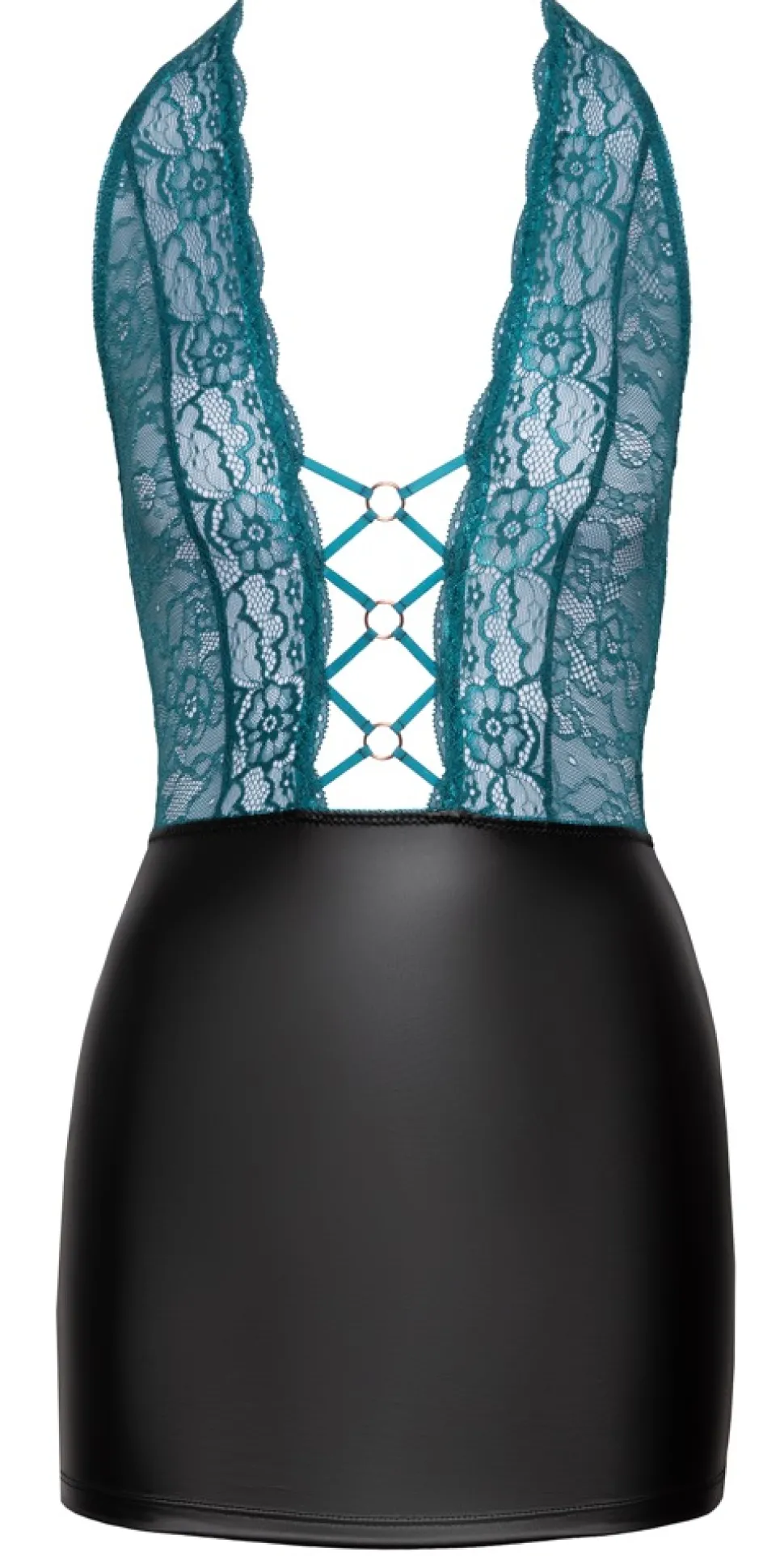 Eng geschnittenes kurzes Kleid von Cottelli LINGERIE in Zweiteiler-Optik mit Oberteil aus feiner petrolfarbener Spitze und Rockteil im edlen schwarzen Mattlook. Bis zum Bauchnabel tief dekolletiert – 3 rosé-goldfarbene Ringe und Stretchbänder halten alles schön zusammen. Rückenfrei, der Neckholder hat einen Clipverschluss.