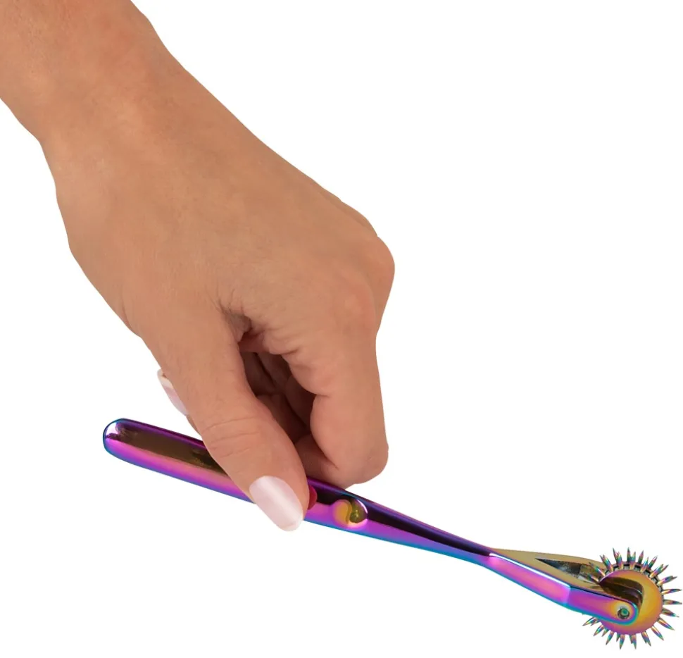 Robustes Metall-Nervenrad Rainbow Double Pinwheel von Fetish Collection in edel schillernden Metallic-Regenbogenfarben. Es wird mit mehr oder weniger Druck über die Haut gerollt und verursacht dabei entweder sanft stimulierende Gefühle oder intensiven, lustvollen Schmerz. Die beiden mit kleinen, sehr spitzen Nadeln besetzten Rädchen können überall am Körper zum Einsatz kommen. Der lange, schmale Griff liegt dabei gut in der Hand und sorgt für optimale Führung und variabel leicht auszuübenden Druck.