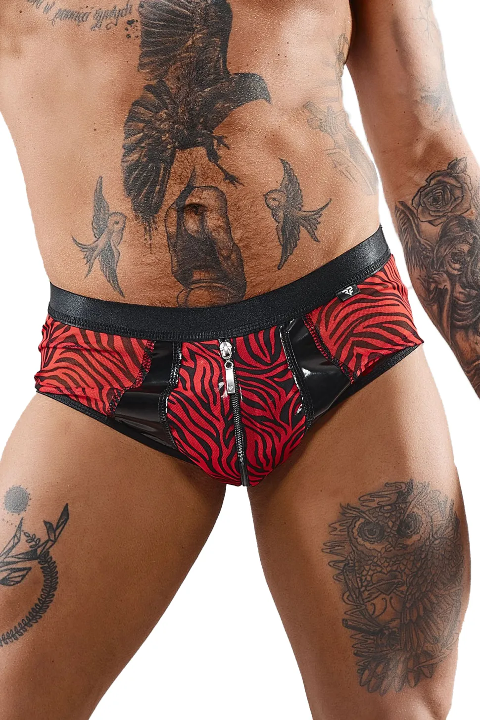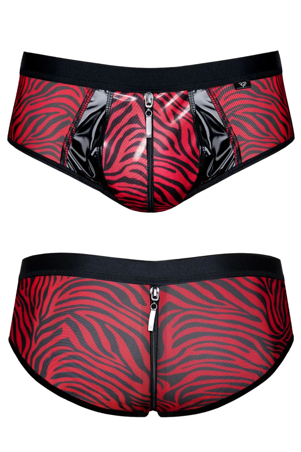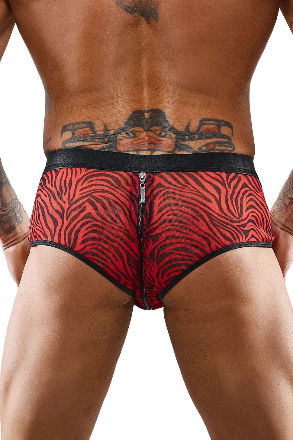 Shorts, gekennzeichnet durch einen Reißverschluss, der sich von beiden Seiten der Vorder- und Rückseite öffnen lässt. Einsätze aus schwarz glänzendem Vinyl. Sie harmonieren wunderbar mit dem schwarzen Gummiband an der Taille, das metallisch schimmert. Das Gesäß wird durch den elastischen Tüll in den Farben Schwarz und Rot im Zebramuster betont.