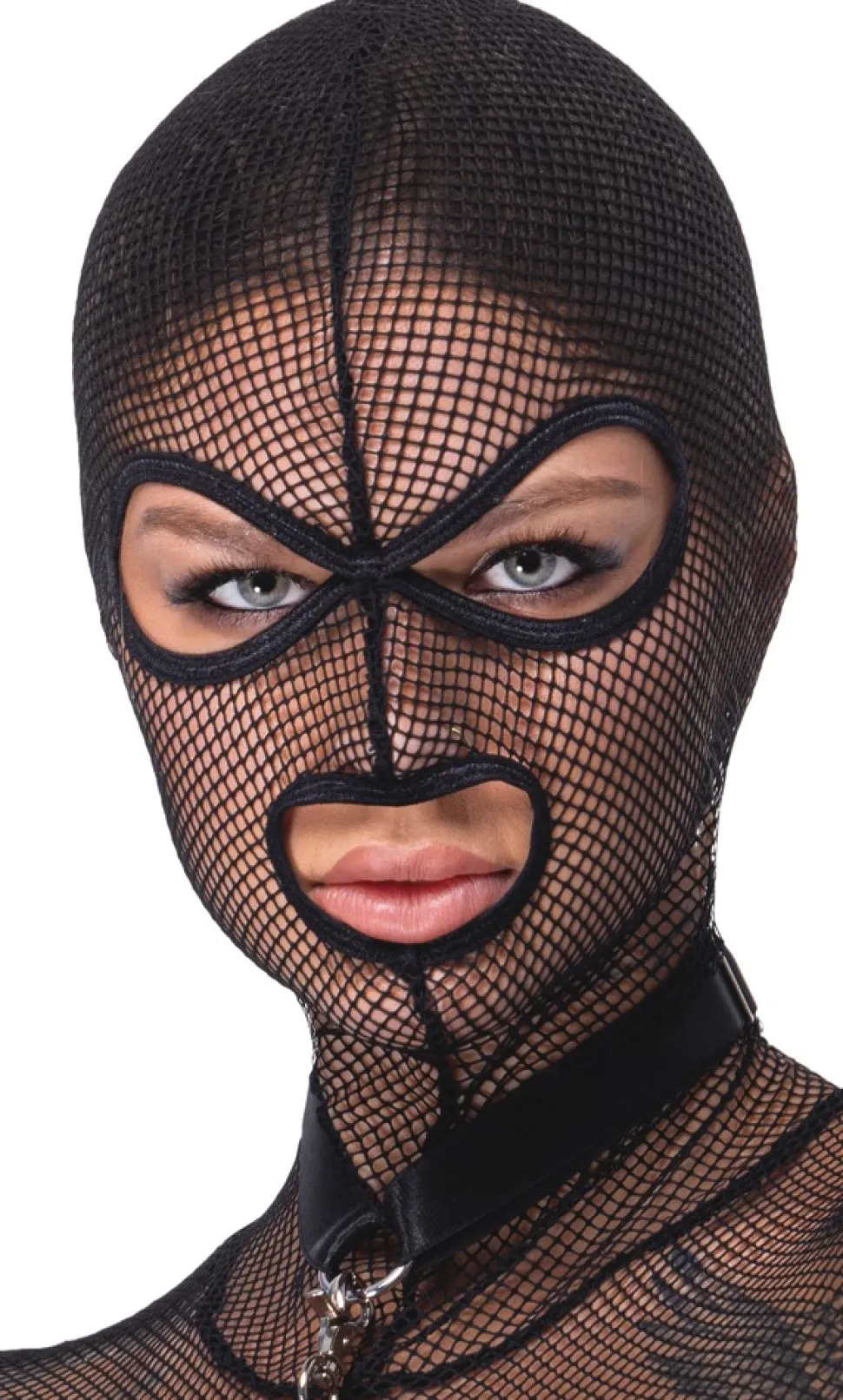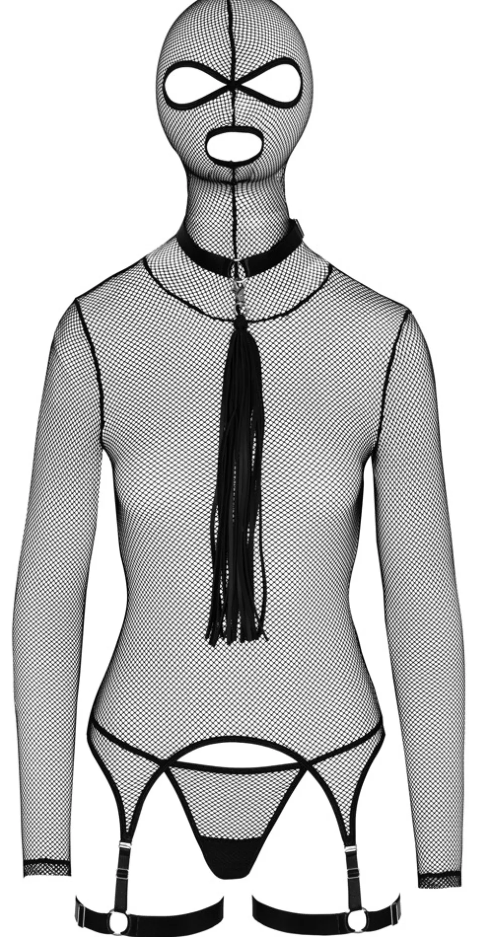 Extravagantes, schwarzes Netz-Set von Bad Kitty bestehend aus Strapshemd mit Kopfmaske, kleinem String und Halsband mit Minipeitsche. Das elastische Netz schmiegt sich weich und komfortabel an. Das verstellbare Choker-Halsband und der abnehmbare, 34 cm lange Flogger sind aus stilvollem Lederimitat gearbeitet. Das Langarm-Strapshemd ist mit elastischen Strapsen und Schenkelriemen ausgestattet, die jeweils passend verstellbar sind. Die Kopfmaske mit Öffnungen für Augen und Mund ist fest angenäht. Der kleine Netz-String komplettiert den aufregenden Transparent-Look.