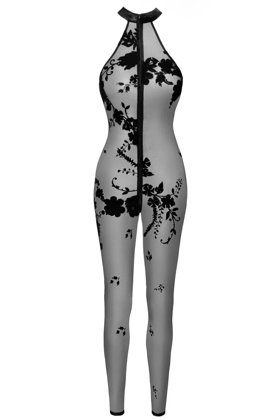 Edler Neckholder-Overall aus Netzstoff mit Wildblumenbeflockung. Mit Reißverschluss und einem gewagten, offenen Schulterdesign. Der Reißverschluss lässt sich individuell öffnen, um einen Cut-Out-Effekt zu erzeugen.