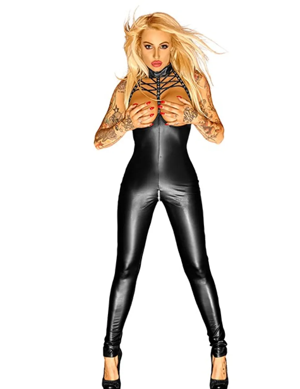Provokant und atemberaubend sexy durch das brustfreie Design mit heißer Schnür-Optik unterhalb des strengen Stehkragens. Sitzt wie eine zweite Haut und ist dabei herrlich schmiegsam und elastisch durch die Powerwetlook-Qualität. Dieses Spezial-Material ist ca. 4 – 5 Mal elastischer als Wetlook in herkömmlicher Qualität und knittert nicht. Der Schritt ist mit einem 2-Wege-Zipper ausgestattet. Der innovative Overall ist ein Modell der neuen DIVA 2016 Kollektion.