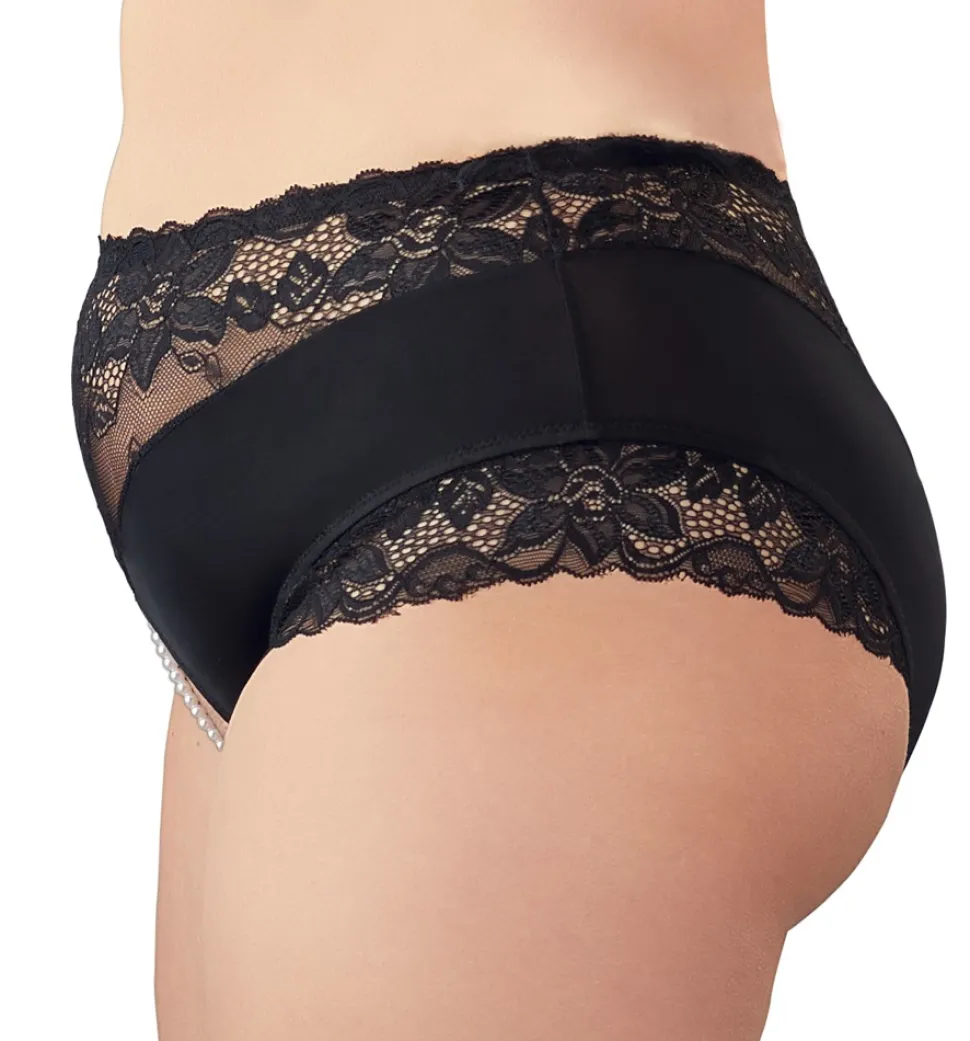 Taillenhoher Slip mit zartem Spitzeneinsatz und elastischer Perlenkette im offenen Schritt. Atemberaubend sexy und gleichzeitig stimulierend bei jeder Bewegung.