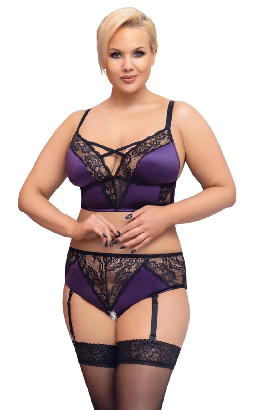 Edle Sünde aus Satin und Spitze! Bustier und Straps-Slip ouvert im Set im edlen Mix aus lilafarbenen Satin und schwarzer feiner Spitze. Das Bustier punktet mit seinen gekreuzten Stretchbändern im Dekolleté, der Taillen-Slip mit seiner einladenden Öffnung im Schritt. Die elastischen breiten Träger sind verstellbar, genauso wie die Strumpfhalter, die vom Slip auch komplett abnehmbar sind.