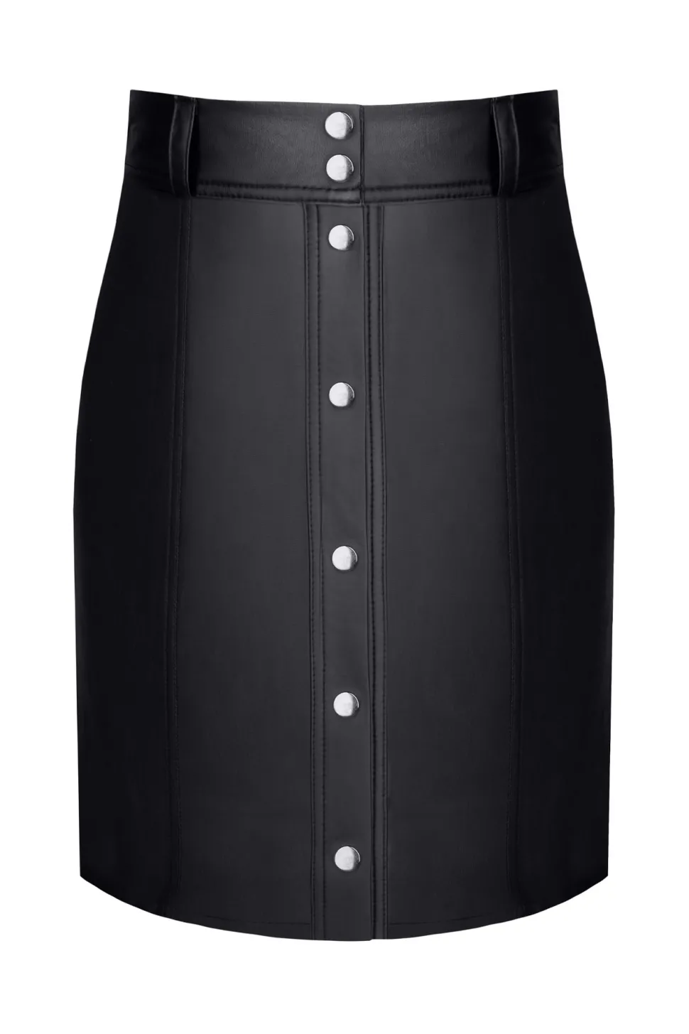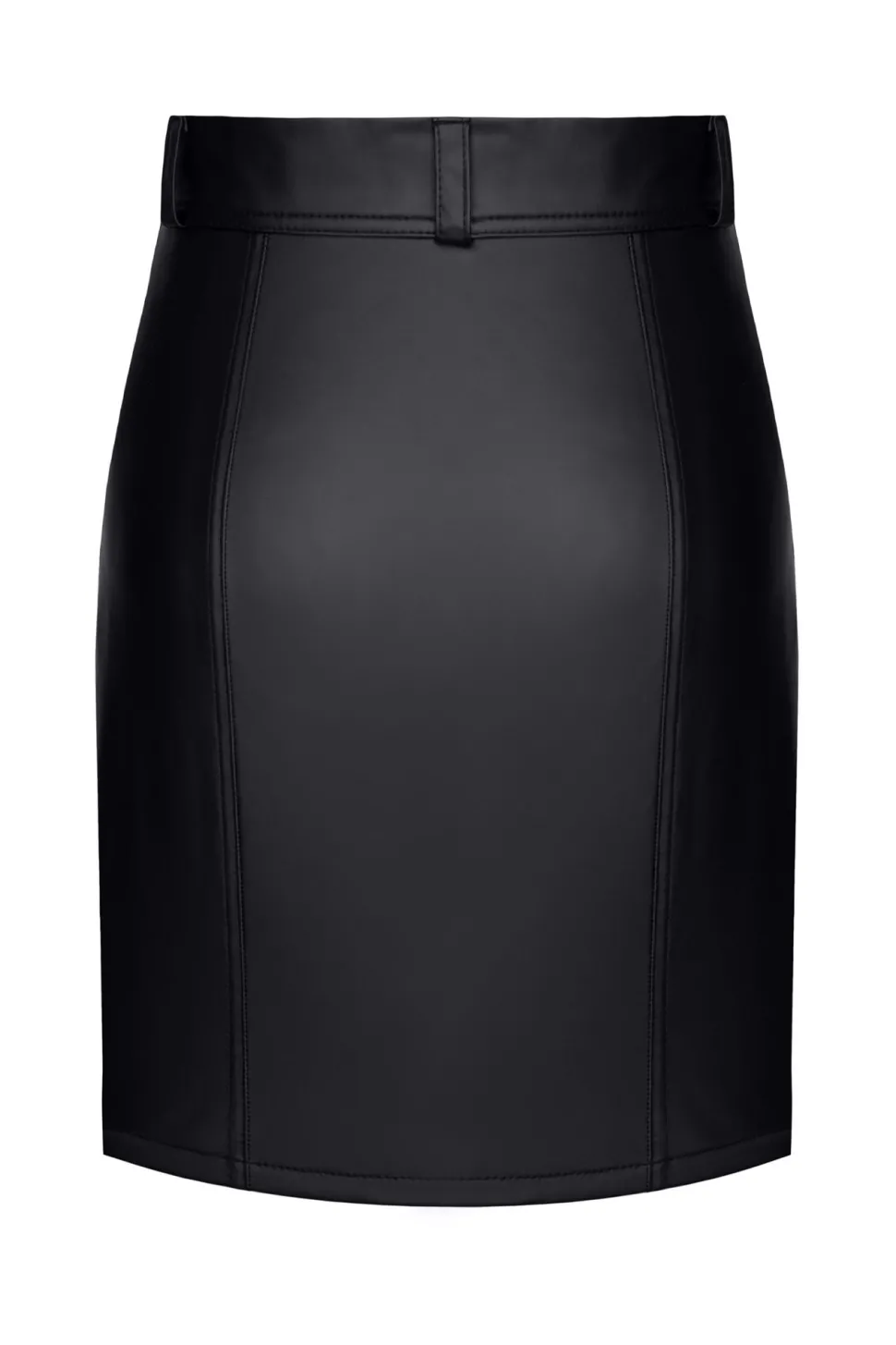Klassischer Rock im Military-Stil. In der Taille schmal und nach unten hin leicht breiter. Komplett aus hochwertigem Wetlook gefertigt. Schwarz und elastisch. Dekorative vertikale Nähte auf der Vorder- und Rückseite. Durchgehende Öffnung vorne. Befestigungen mit silbernem Metall und Ziernieten. An der Taille befinden sich Gürtelschlaufen, sodass Sie einen Gürtel damit tragen können.