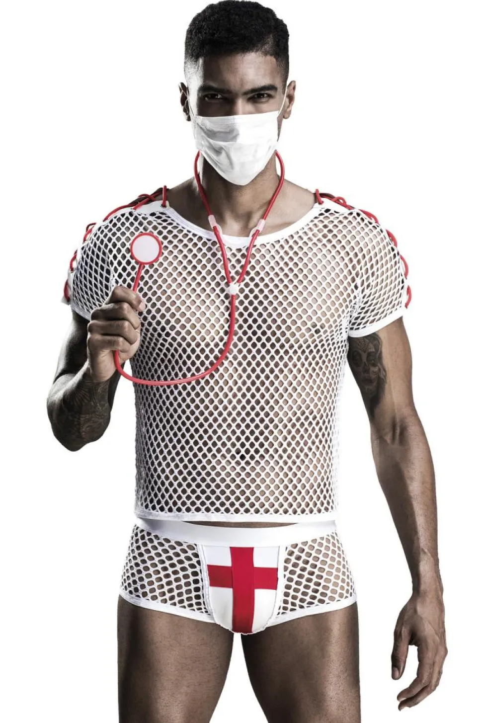 Mit diesem Roleplay-Kostüm wirst Du Dein Gegenüber so richtig in Fahrt bringen. Das heiße und mehrteilige Doktorkostüm für Männer besteht aus einem Netz-Shirt, mit farblich abgesetzten Zierbändern und eine dazu passende Netz-Short. Mit im Set enthalten ist ein Spielzeug-Stethoskop und eine Maske.