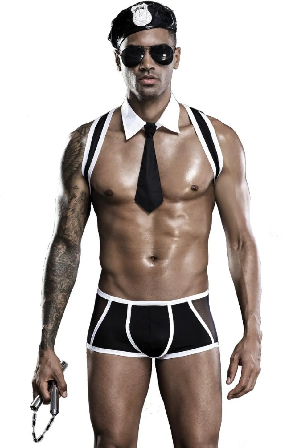 heißes, mehrteiliges Cop – Kostüm. Bestehend aus, stilechte Mütze mit Emblem, Shorts mit transparenten Einsätzen, Kragen mit kurzer Krawatte und die coole Sonnenbrille ist ebenso dabei 🙂