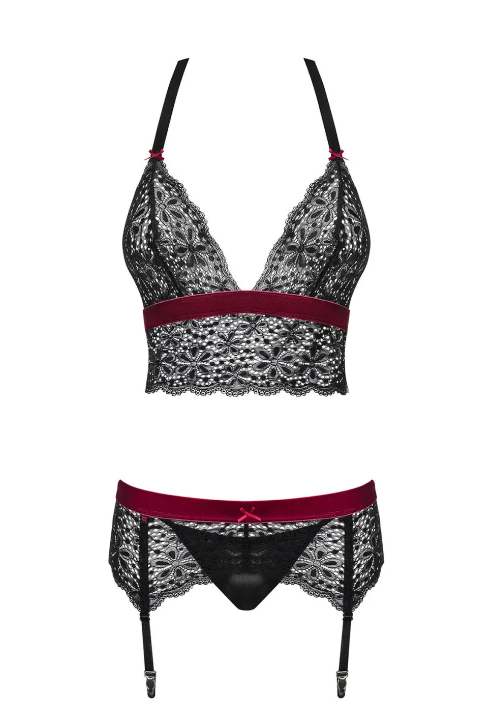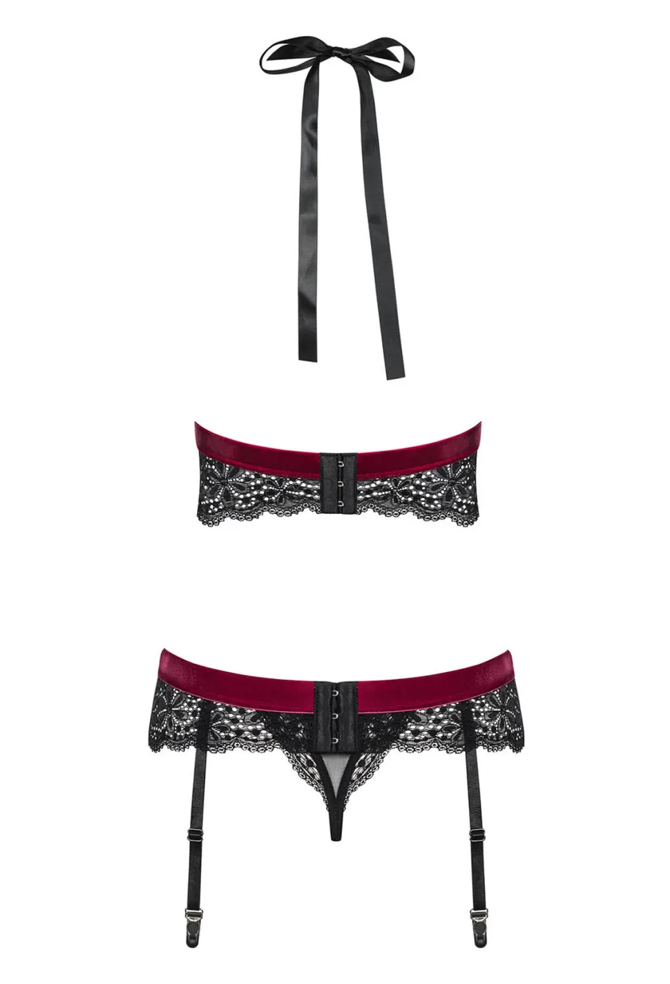 Egal, ob du für das sexy Untendrunter im Alltag oder für die Verführung des Liebsten – dieses vielseitige Set macht sich in jeder Situation gut. Highlight des Sets ist das Spitzenbustier mit seinem Neckholder-Träger, dem tiefen V-Ausschnitt und der Spitzenbordüre. Im Set ist ebenfalls ein zum Bustier passender String, sowie ein Strumpfgürtel enthalten.