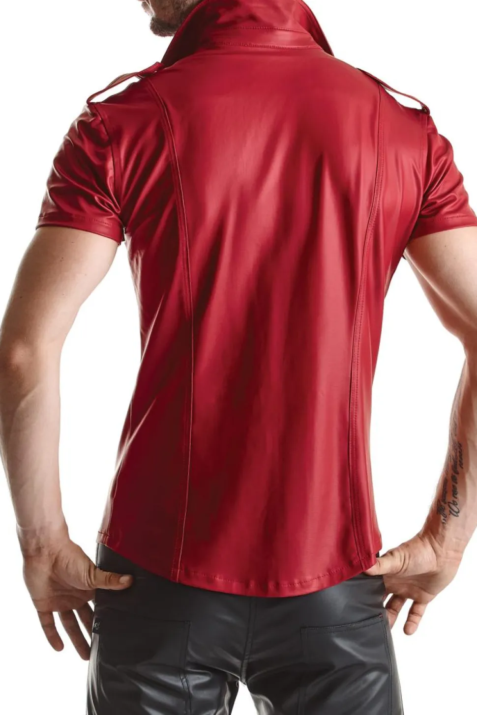 Ein wunderschönes, klassisches Hemd im Military-Schnitt. Lange vertikale Steppnähte vorn und hinten. Das Shirt hat einen Slim-Fit-Schnitt, der die Figur in der Taille optisch verschmälert und die Brust breiter wirken lässt. Schön sind auch die dekorativen Druckknöpfe an den Taschen, Schulterklappen und vorne über die gesamte Länge. Shirt aus rotem, elastischem Wetlook-Masterial, das sich angenehm anfühlt und sich schön der Figur anpasst.
