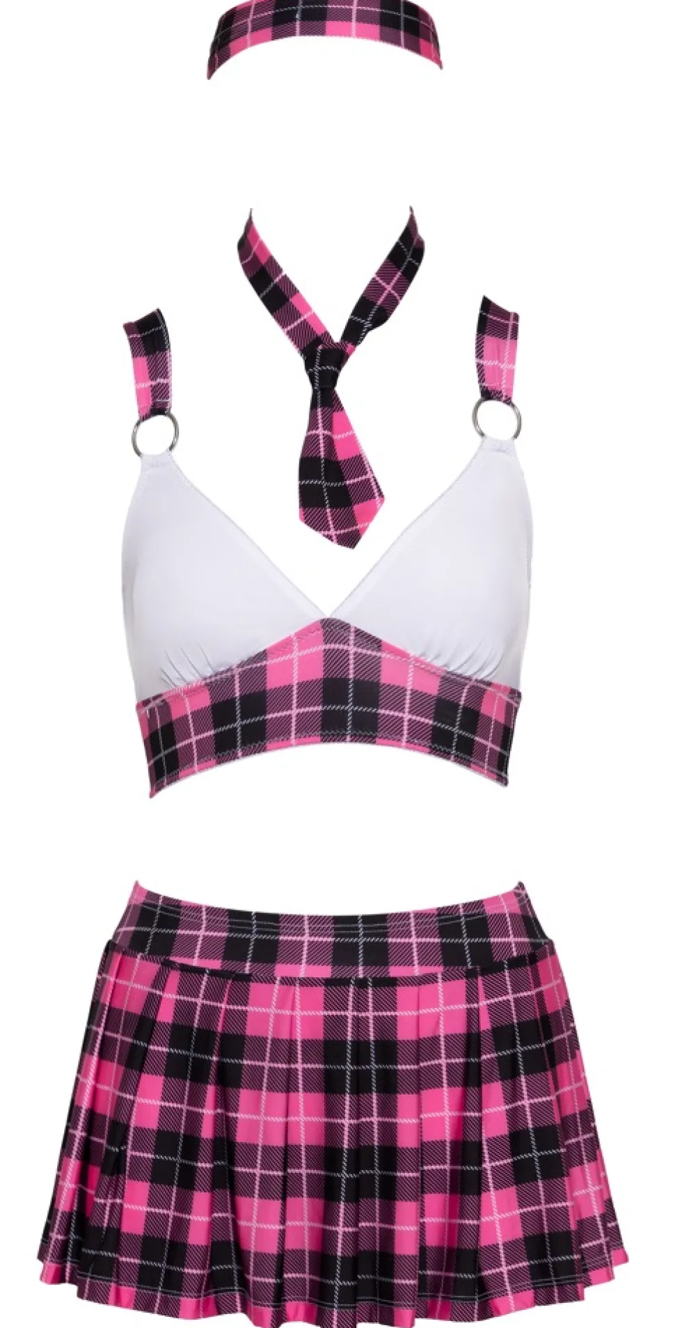 Hochwertiges 4-teiliges Schuluniform-Kostüm von Cottelli COSTUMES im pink/schwarz/weißen Karo-Look. Bestehend aus Top, Faltenröckchen, typischer Krawatte und Haarband. Top mit weißen Cups und Ringen für die breiten Träger, die im Rücken über Kreuz verlaufen. Extra kurzes Röckchen mit bequemem Stretchbund.