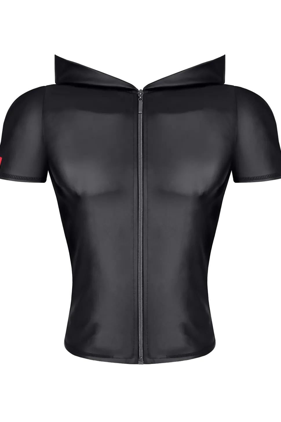 T-Shirt aus glattem, schwarzem Wetlook mit dezentem Glanz. Die weite, tiefe Kapuze und der dunkle Reißverschluss mit eingraviertem RFP-Logo verleihen ihm einen markanten, unverwechselbaren Charakter. Zwei vertikale Nähte am Rücken formen die Silhouette optisch – sie betonen die Taille und heben Schultern und Brust für einen sportlicheren Look hervor. Ziernähte an Ärmeln und Saum sorgen für Raffinesse und Präzision.