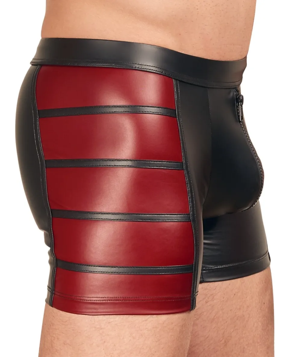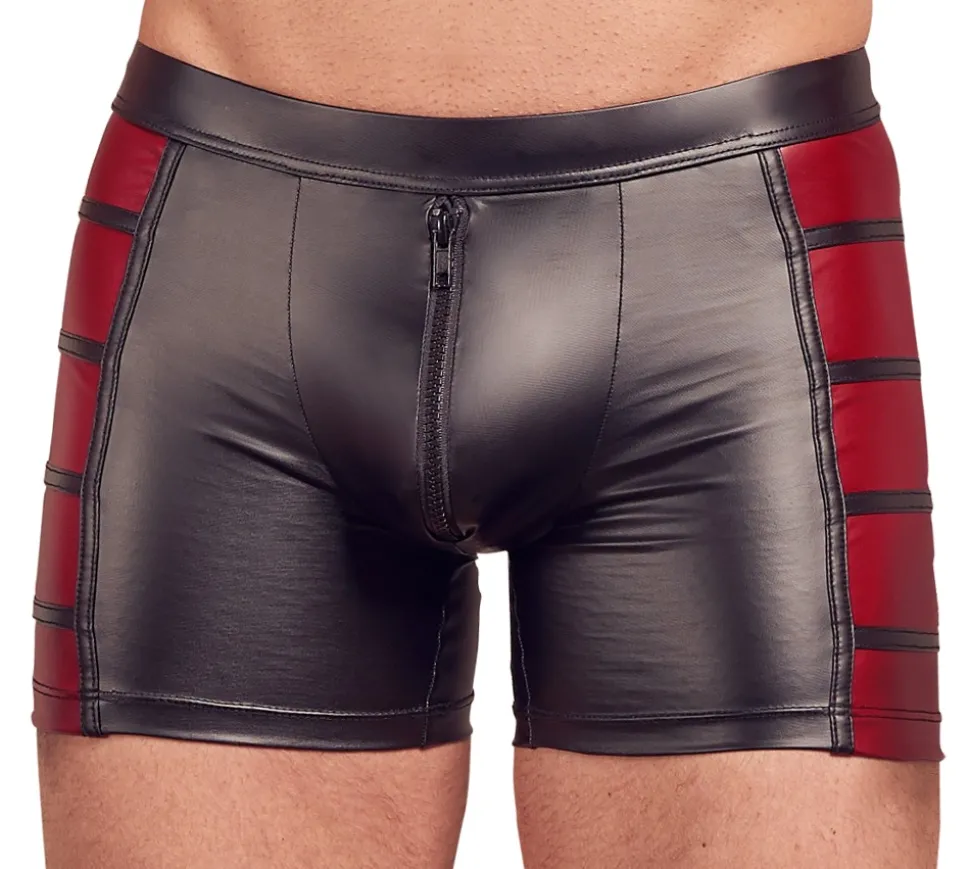 Schwarze Pants von NEK im trendigen Mattlook mit roten Einsätzen jeweils seitlich. Vorne mit unterlegtem Reißverschluss, der sich für praktische und erotische Zwecke schnell öffnen lässt. Fantastisch elastisch für hervorragenden Tragekomfort.