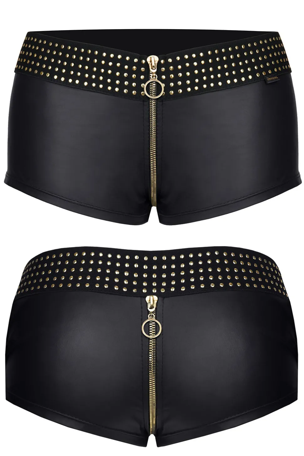 Aufregend sinnliche Shorts mit goldenem Reißverschluss. Hergestellt aus Wetlook-Stoff, der sehr strapazierfähig und elastisch ist. Dank dieser Eigenschaften passt sich die Shorts perfekt dem Körper an und betont verführerisch seine Form. Auf der Rückseite ist der Stoff zu geschnitten, dass er die Sexyness und Rundheit des Gesäßes hervorhebt. Oben befindet sich ein breites, schwarzes Gummiband mit dekorativen Ornamenten in Form kleiner, goldener Punkte. Reißverschlüsse mit dekorativen, runden, goldenen Anhängern. MUST HAVE!