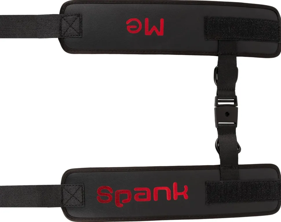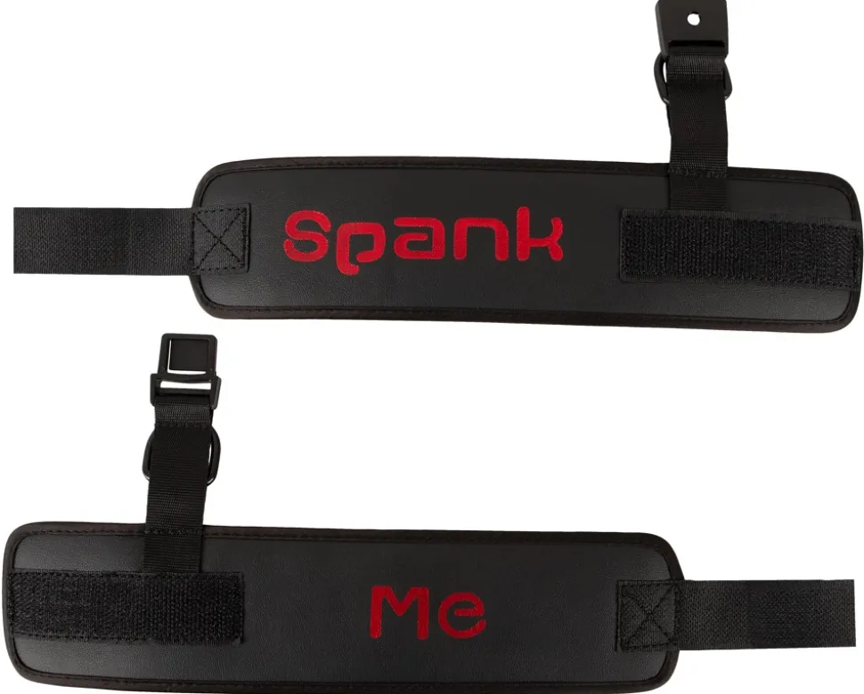 Softe Handfesseln Spank me-Cuffs von Bad Kitty verbunden durch kurzes Webband mit praktischem Clipverschluss. In Schwarz mit rotem Spank me-Schriftzug. Fesselmanschetten mit Klettverschluss im Umfang verstellbar, sowie schnell an- und abgelegt.