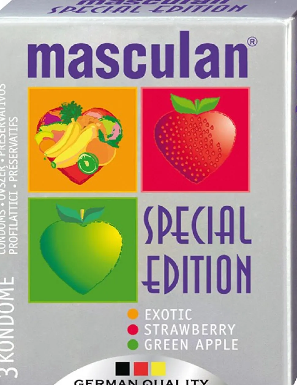– Kondome mit Gleitfilm und Reservoir, gefärbt und aromatisiert