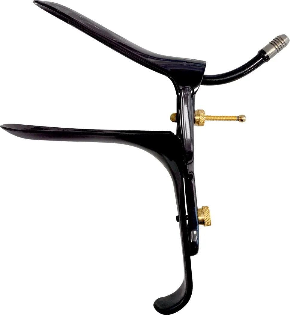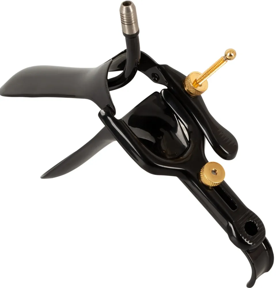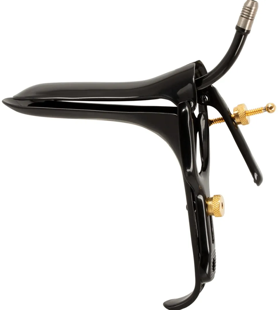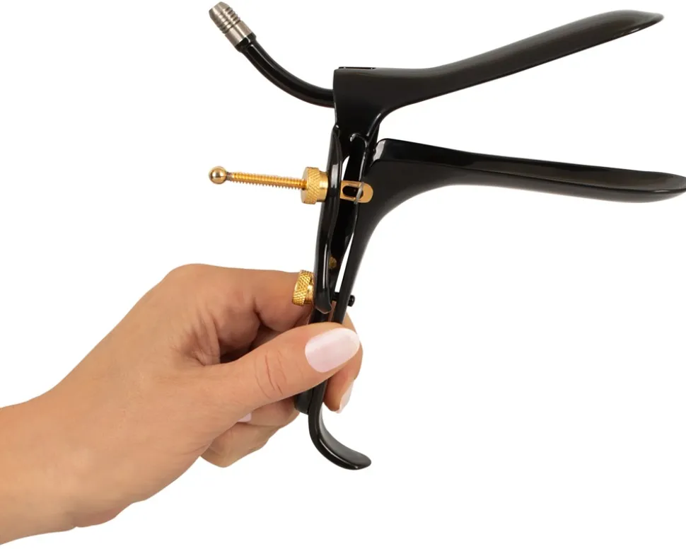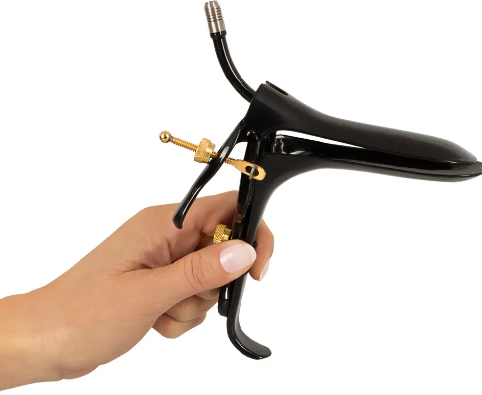 Speculum with Air-&-Liquid-Tube von Fetish-Collection in edler schwarzer Optik mit goldfarbenen Details. Lässt sich für vaginale und anale Untersuchungen leicht einführen und bequem spreizen. 2 Stellschrauben bieten optimale Verstellmöglichkeiten in Schnabelhöhe und Öffnungswinkel. Am bzw. im oberen Schnabel befindet sich ein Schlauchröhrchen für Luft oder Flüssigkeiten.