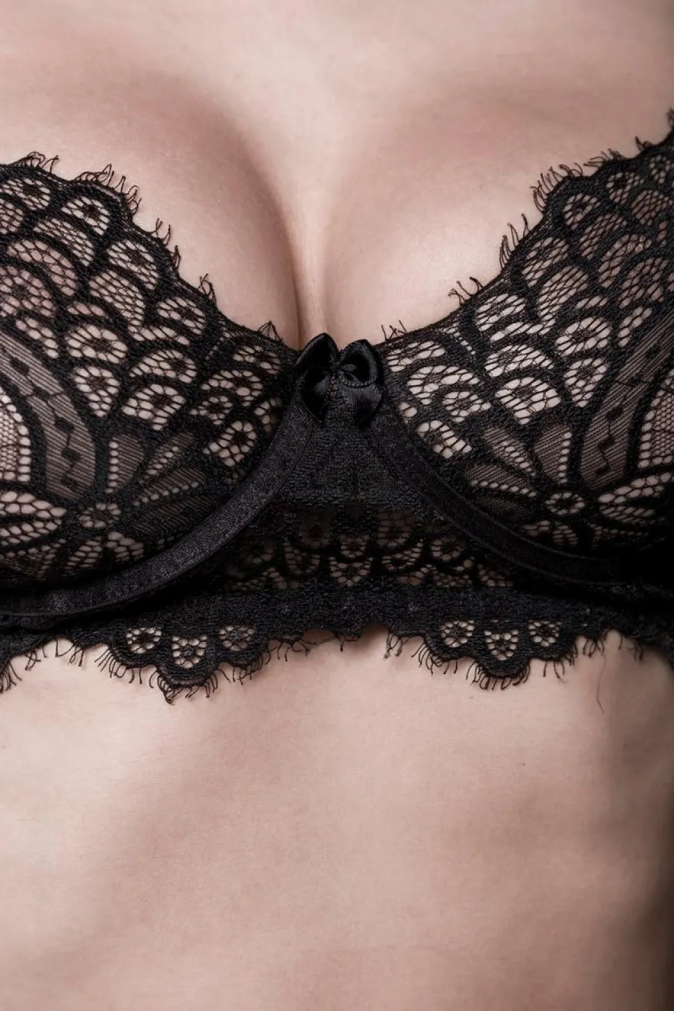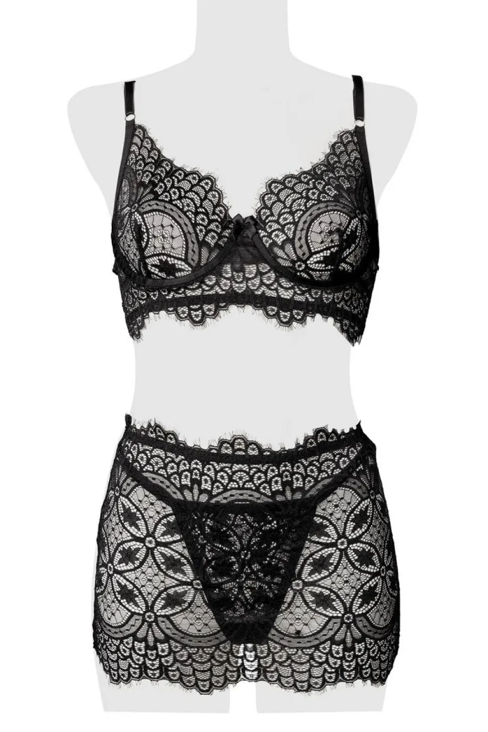 Hochwertiges BH-Set aus feiner Spitze mit floralem Muster. Der Bügelbustier hat verstellbare Träger und der Rock sitzt high-waist.
