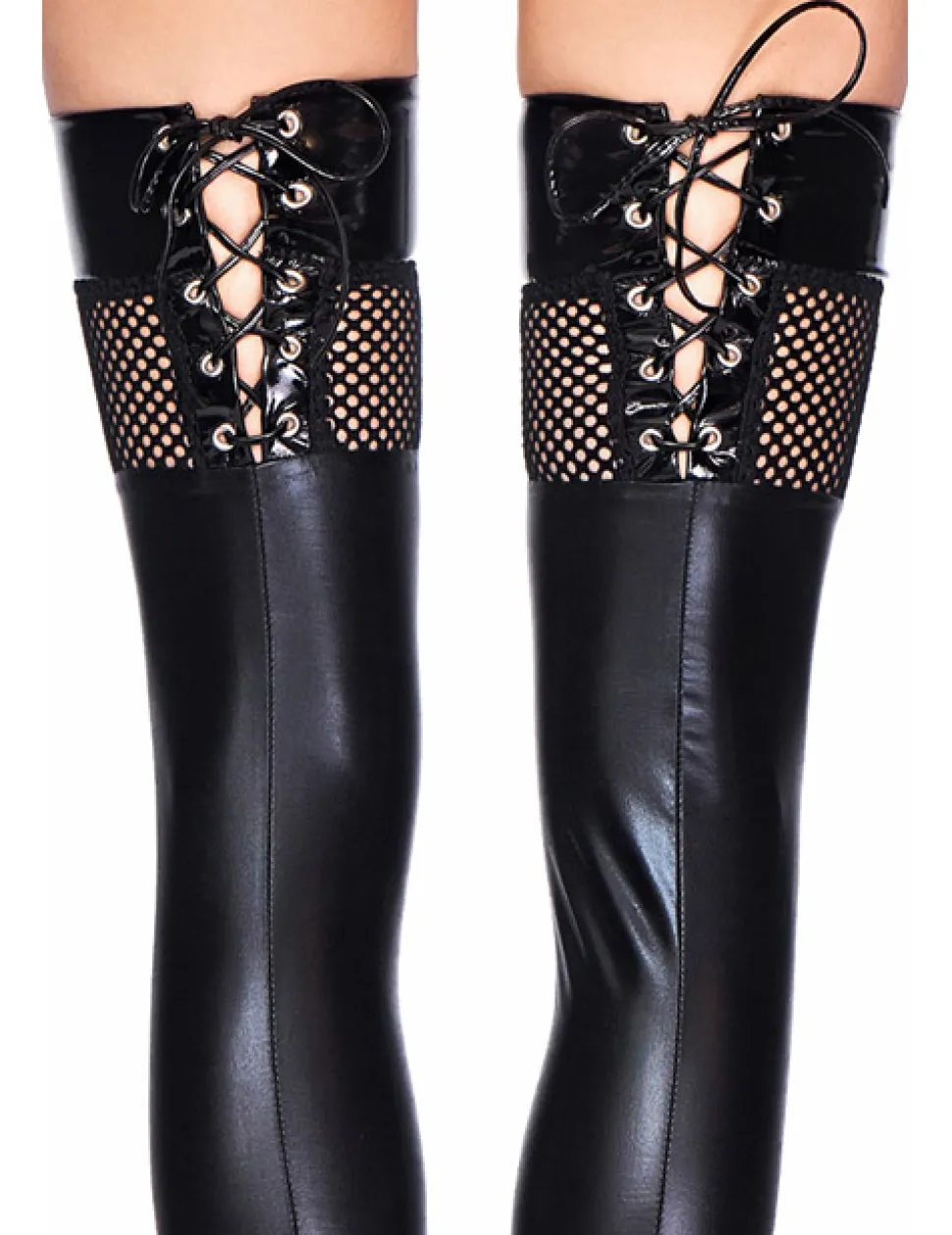 – Strümpfe aus dehnbarem Wetlook-Material