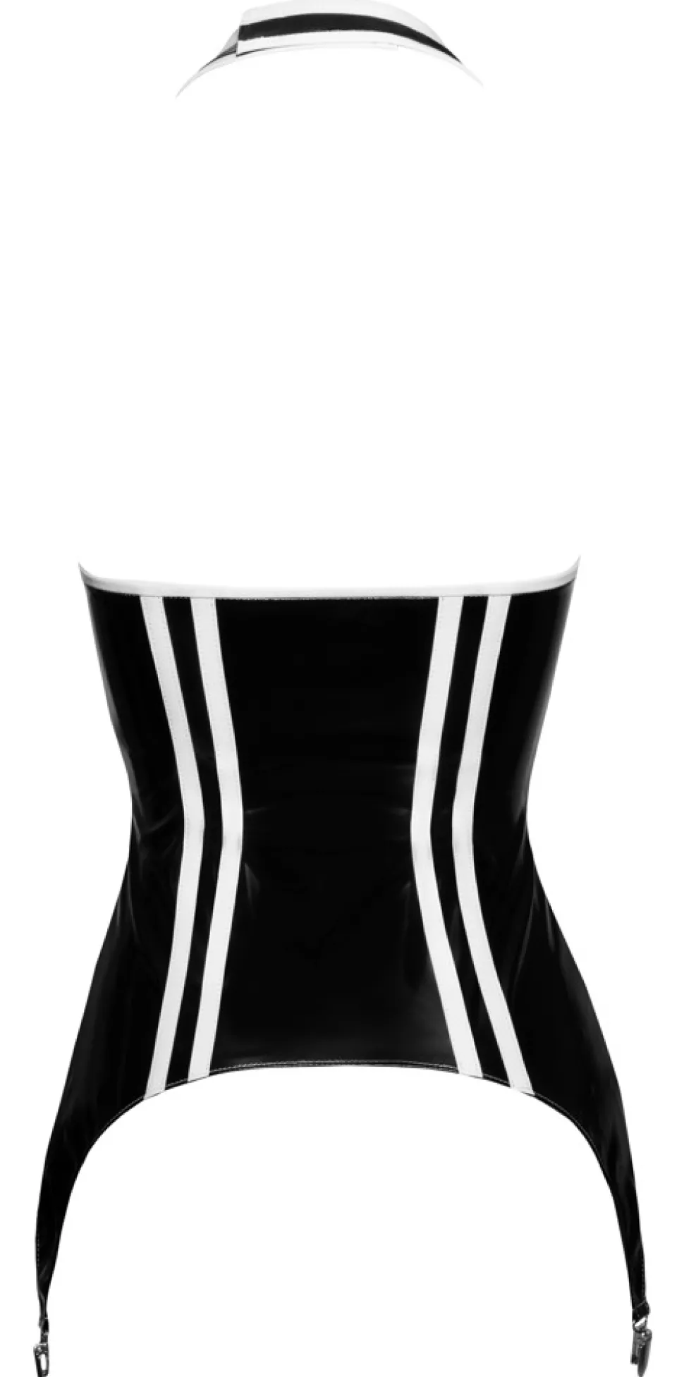 Rasante Streifen für glänzende Kurven und wilde Nächte! Aufsehenerregendes Strapshemd von Black Level im schwarzen Lackglanz mit weißen Lack-Paspelierungen und -Streifen. Vorne mit praktischem, durchgehendem Reißverschluss. Rückenfrei – Neckholder mit Klettverschluss. Die 4 Metall-Strumpfhalter (Clips) sind fest am Strapshemd angenäht.