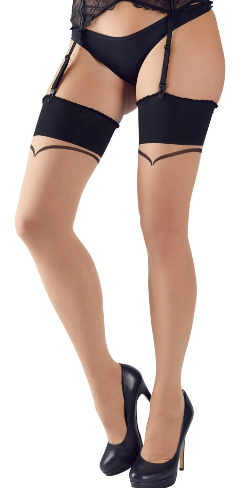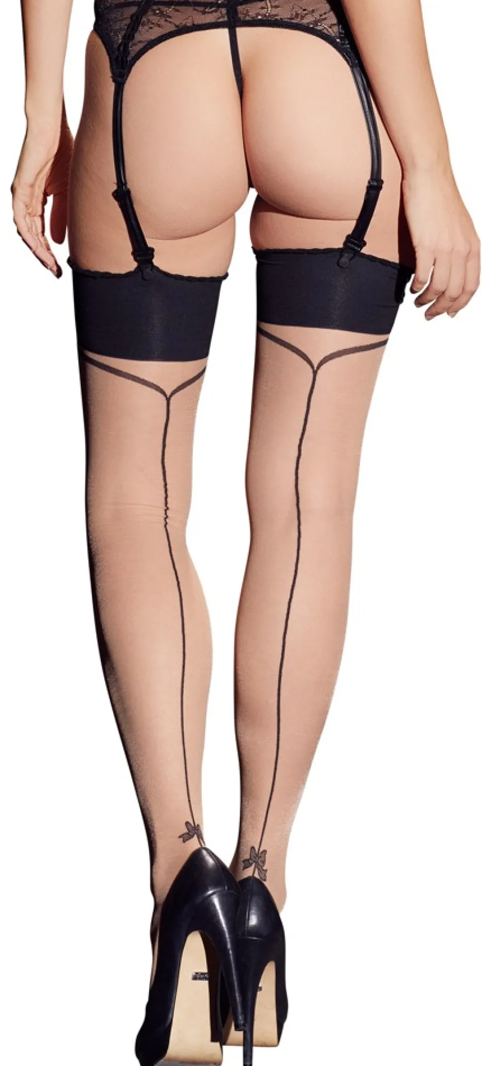Strapsstrümpfe mit elegantem Abschluss und ästhetischer Naht. Eine kleine Schleife ist über der Hochferse eingewebt. Die Zehen sind für mehr Strapazierfähigkeit verstärkt. 20 DEN, Oeko-Tex zertifiziert.