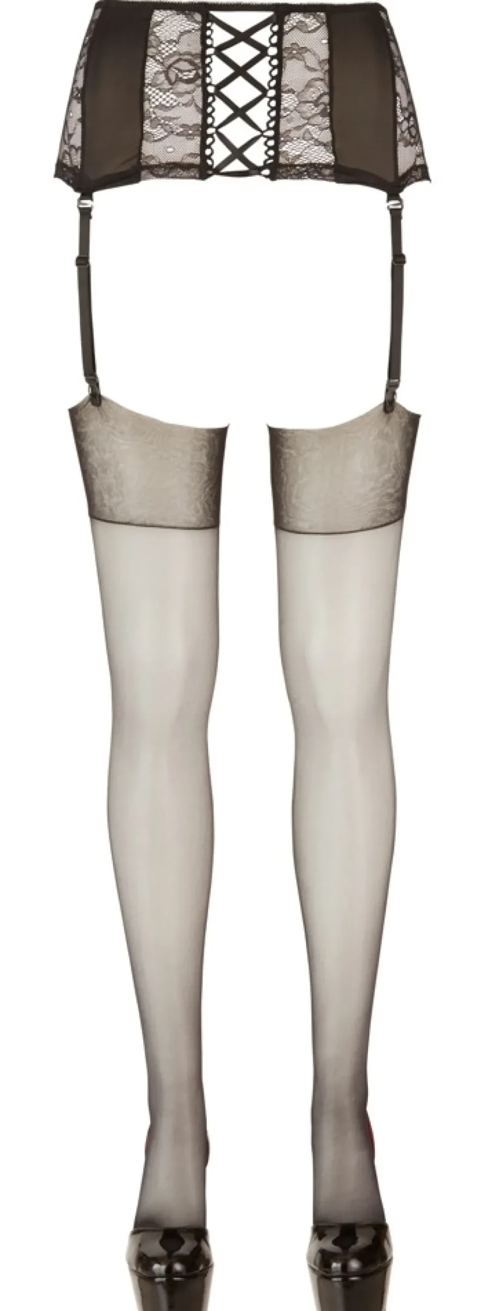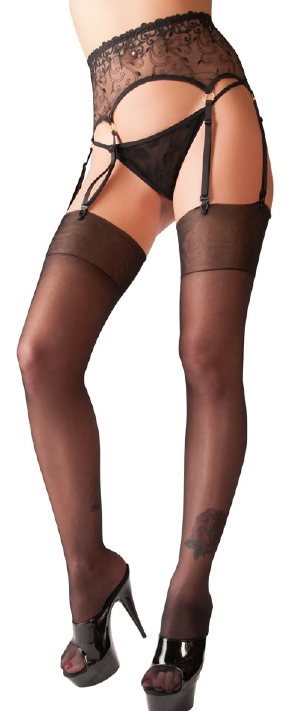 Straps-Strümpfe mit vorgeformten Fuß. Aus seidig glänzendem Material mit schlichtem Abschluss.