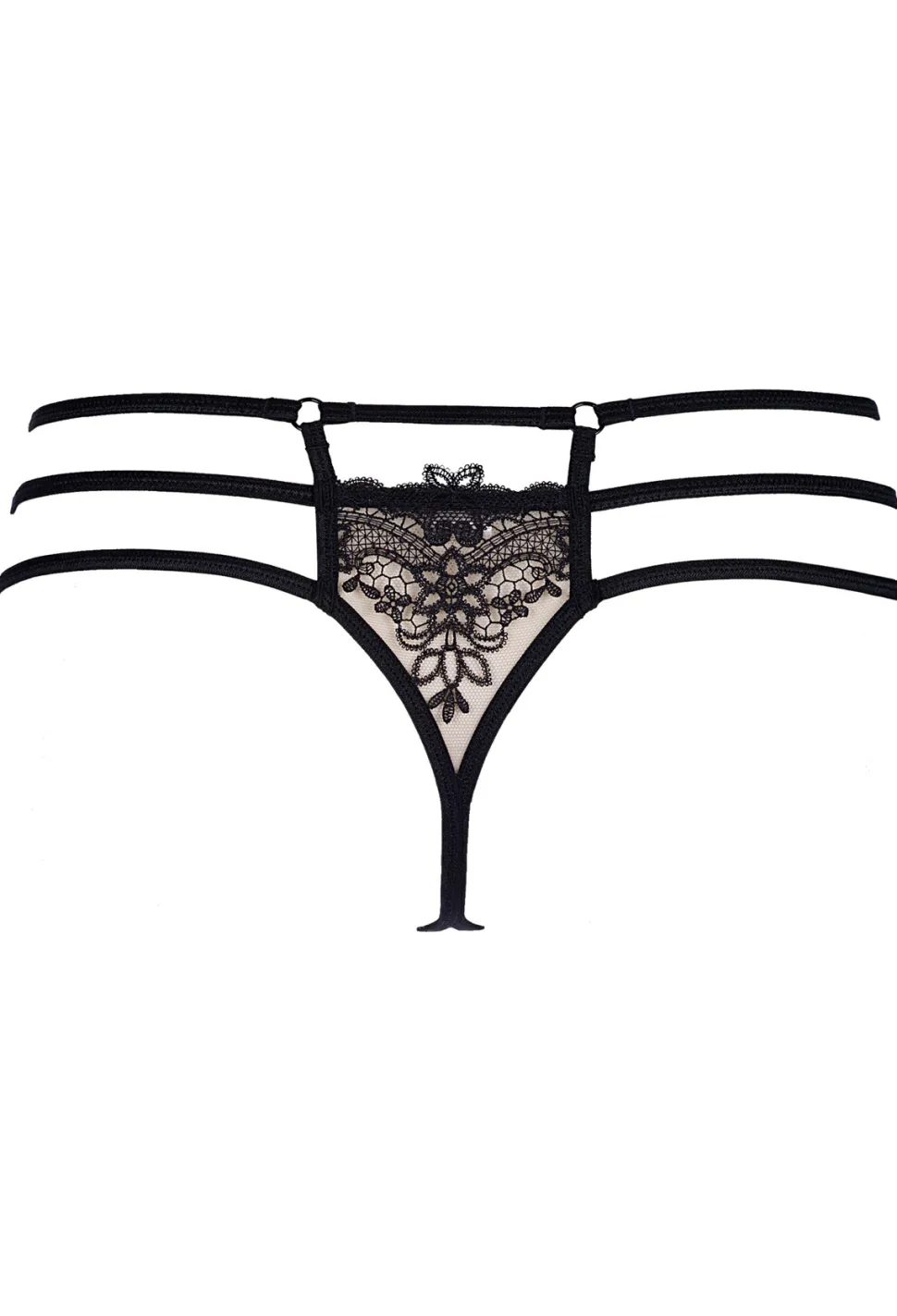 Es erwartet Dich ein verführerischer Riemchenstring. Er ist aus einer Kombination aus beigem Tüll und zarter, schwarzer Blütenspitze gefertigt. Ein echter Hingucker! Besonders erotisch sind die elastischen Riemchen auf der Vorder – und Rückseite.