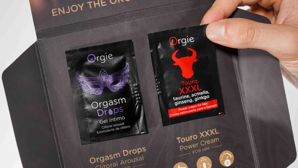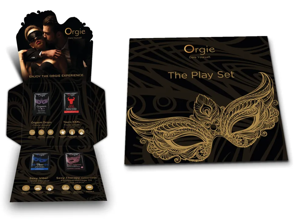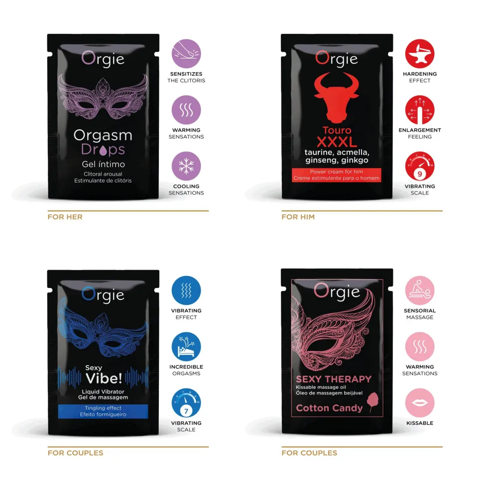 Das Spielset ist eine Kombination aus 4 Orgie-Bestsellern im Format von 2ml-Sachets und ist die ideale Wahl für einen romantischen Kurzurlaub, ein schönes kleines Geschenk oder zum Ausprobieren dieser Orgie-Produkte. Es enthält die Sachets: 1 Orgasm Drops, 1 Touro XXXL, 1 Sexy Vibe! Liquid Vibrator, 1 Sexy Therapy Kissable Massage Oil Cotton Candy.