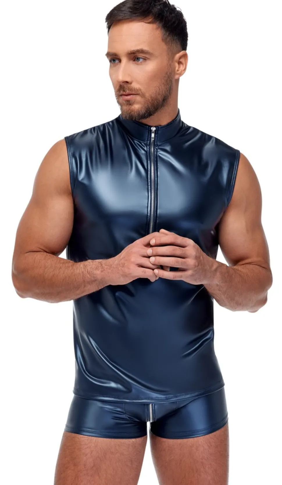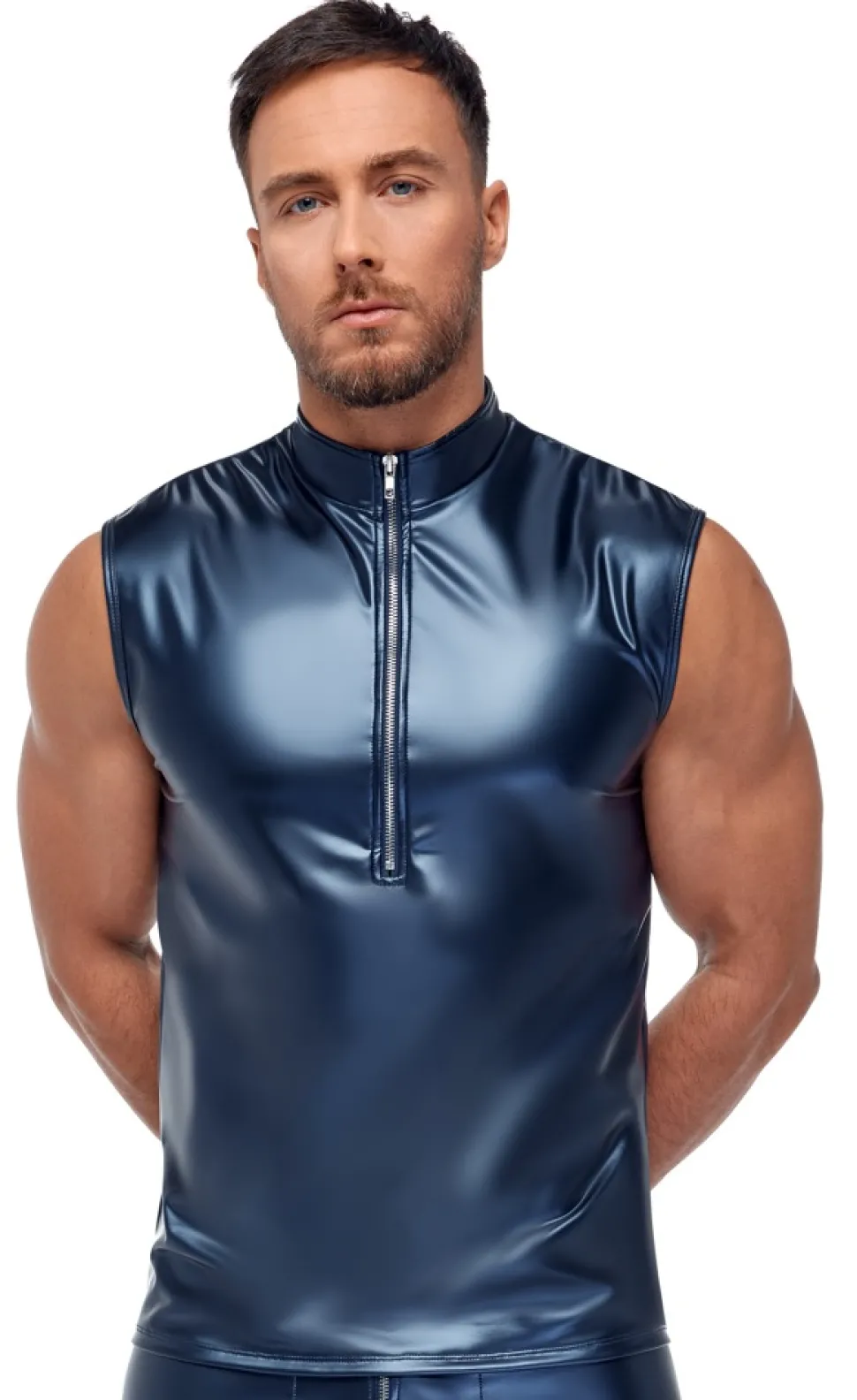 Edler Metallic-Mattlook, der zum Berühren verführt! Blaues Shirt von NEK im trendigen Metallic-Mattlook. Ärmellos, eng und körperbetont geschnitten. Mit kleinem Stehkragen und silberfarbenem Reißverschluss vorne. Weich und elastisch für hervorragenden Tragekomfort.