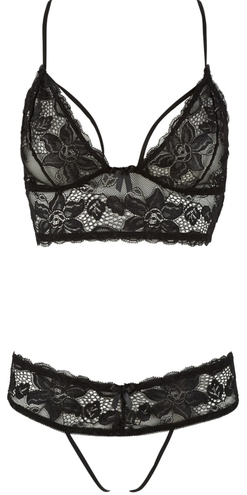 Sinnliches Bralette aus weicher Blütenspitze mit aufknöpfbaren Cups. Die Rückenansicht entzückt mit einem aufwendigem Racerback. Der dazugehörige String hat einen extra breiten Spitzenbund. Sein komplett offener Schritt umrahmt den Venushügel mit zwei elastischen Bändern.