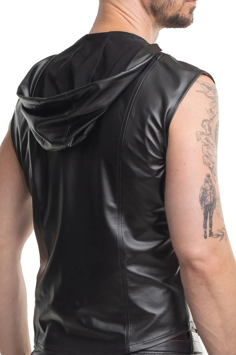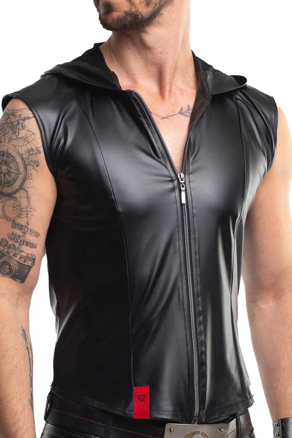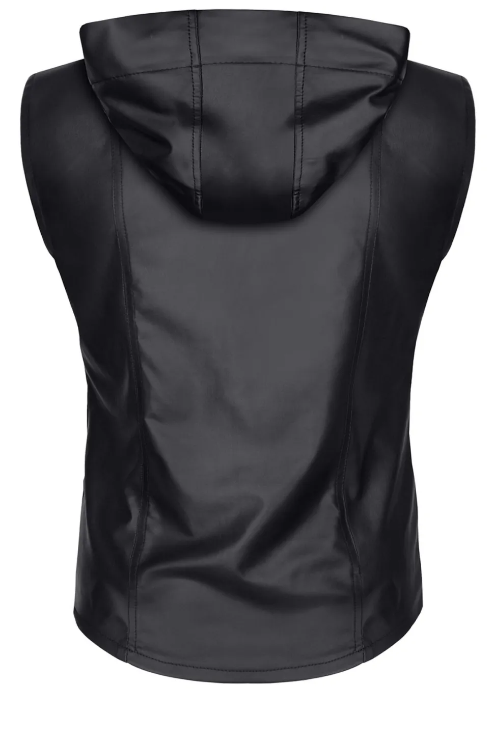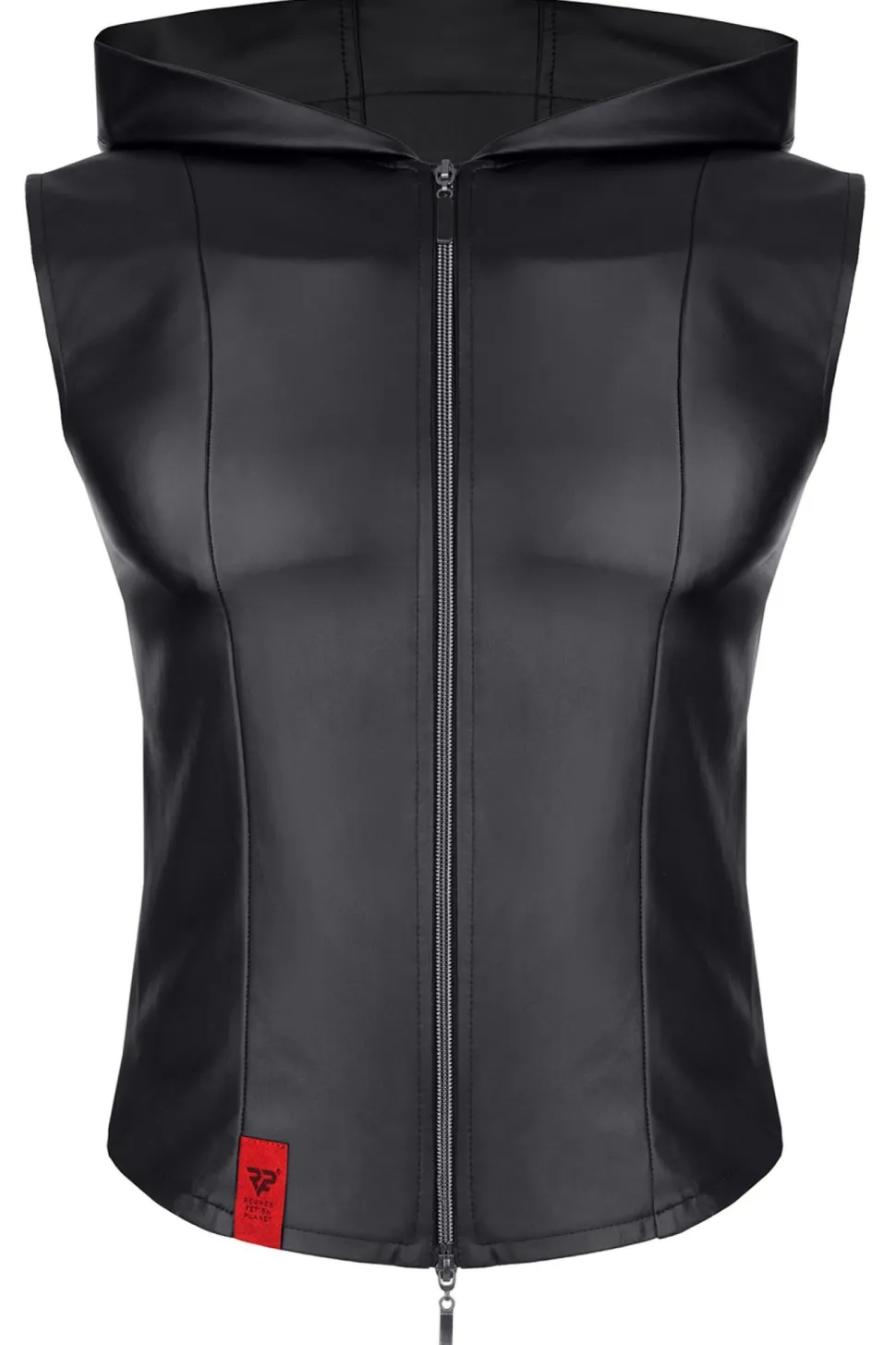 Diese elegante Weste mit Kapuze ist aus schwarzem, elastischem Wetlook-Material gefertigt. Sie verfügt über zwei dekorative und zugleich funktionale Taschen mit eleganten Verschlüssen und einem schwarzen Riemen. Der dunkle Reißverschluss lässt sich von oben und unten öffnen und ist mit dem RFP Regnes Fetish Planet-Logo graviert. Vertikale Ziernähte auf Vorder- und Rückseite verleihen der Weste eine einzigartige Optik und schmeicheln der Figur. Sie betonen die Taille, Schultern und Brust und lassen die Silhouette muskulöser wirken.
