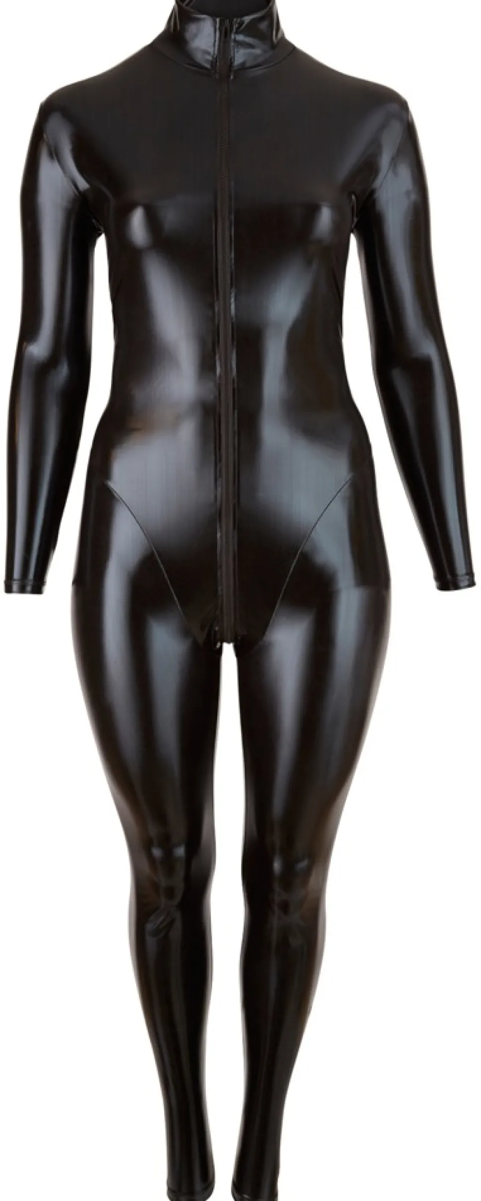 Eng anliegender Overall mit langen Armen und Beinen, sowie Stehkragen. Der 2-Wege-Zip geht vom Stehkragen bis zum Steiß und ermöglicht ein schnelles Fallenlassen der Hüllen oder einfach nur ein Entblößen des Schoßes.