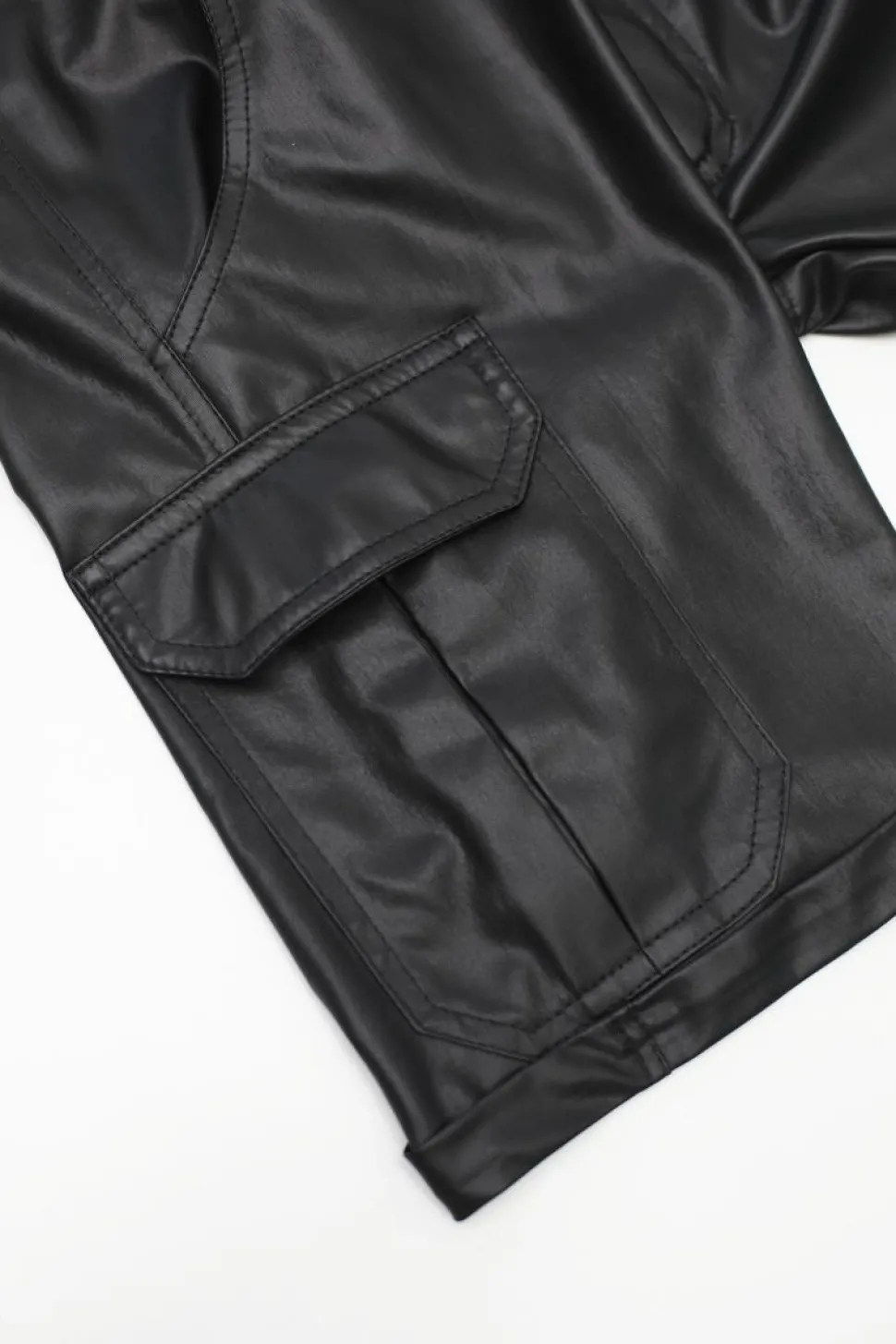 Aufregende Cargo-Shorts aus schwarzem, elastischem Wetlook mit abgesenkter Taille. An Hüfte und Beinen ist sie etwas lockerer geschnitten. Sie hat 6 funktionelle Taschen. Zwei Taschen vorne, 2 hinten und 2 an den Oberschenkeln. Dank dessen ist es kein Problem,Telefon, Brieftasche und andere kleine Gegenstände zu verstauen. Die Hose hat Gürtelschlaufen zum Tragen eines Gürtels. Das charakteristische rote Alcantara-Etikett mit RFP-Logo und punktroter Naht – wird jeden begeistern, der raffinierte und einzigartige Details schätzt.