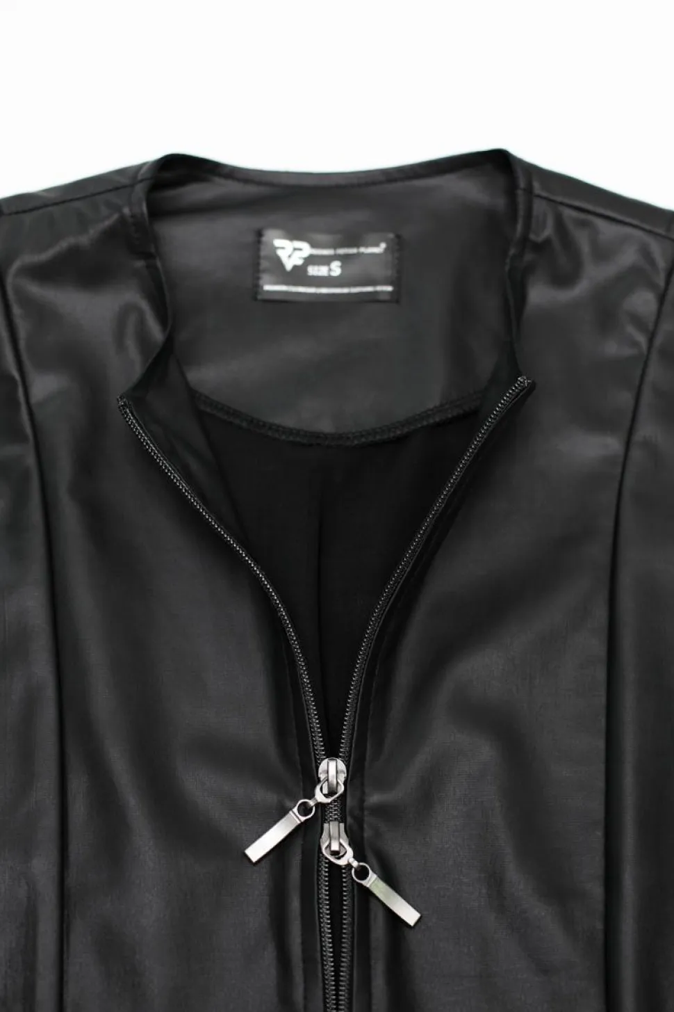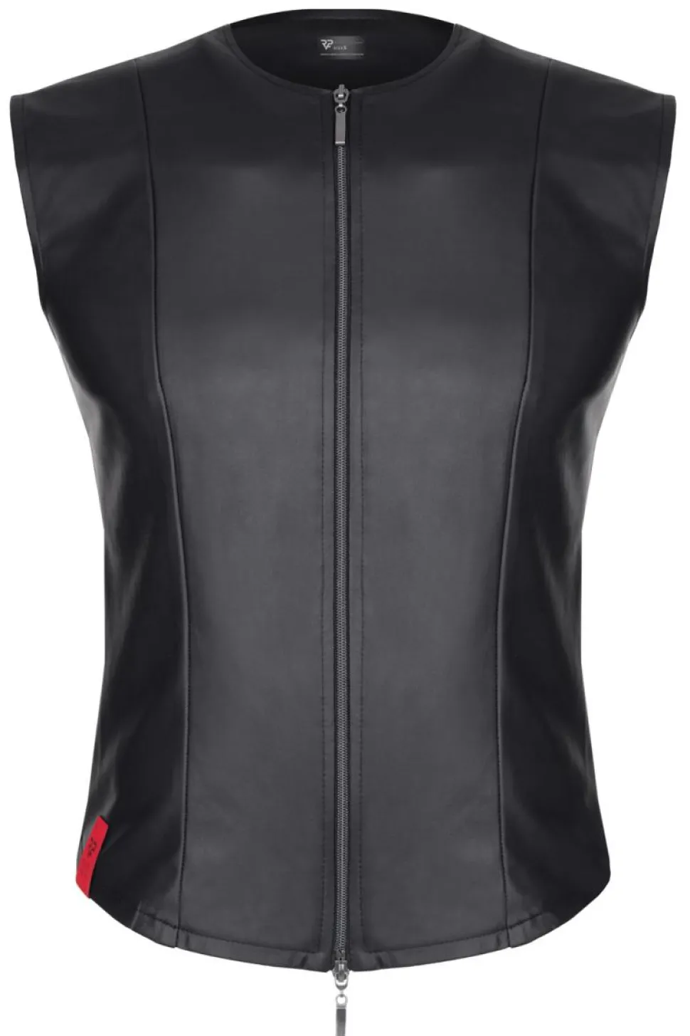 Moderne Weste aus schwarzem, elastischem Wetlook. Auf der Vorderseite befindet sich ein dunkler Reißverschluss, der von beiden Seiten – oben und unten – abnehmbar ist. Die Reißverschlüsse sind mit dem Logo von Regnes Fetish Planet graviert. Es gibt vertikale Stiche auf der Vorder- und Rückseite. Sie verleihen einen einzigartigen Look und verschmälern die Taille und verbreitern die Schultern und Brust optisch. Dieser Effekt lässt die Silhouette muskulöser erscheinen. Das charakteristische rote Alcantara-Label mit dem RFP-Logo und punktroten Nähten wird jeden begeistern, der raffinierte und einzigartige Details schätzt.
